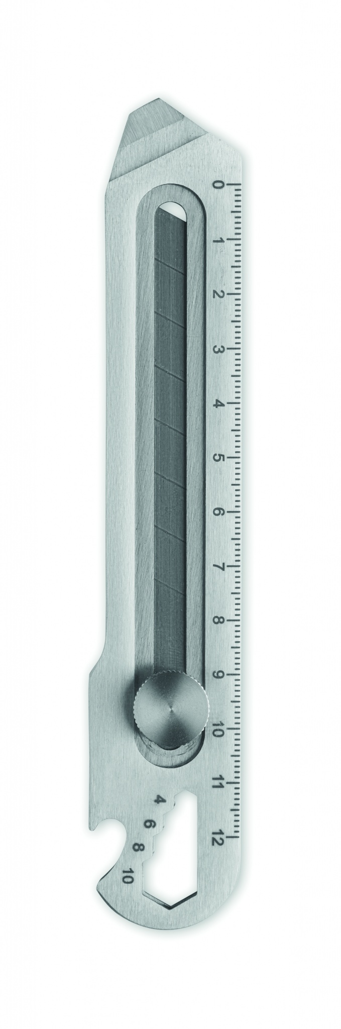 Einziehbares Cuttermesser mit 8 Klingen aus Karbonstahl, Kapselheber, Schraubenschlüssel und Lineal.