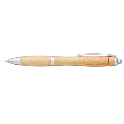 Kugelschreiber mit Klickmechanismus, mit einem Schaft aus Bambus, akzentuiert durch einen verchromten Clip und Verzierungen aus ABS-Kunststoff. Die Farbe des Bambusmaterials kann variieren.
