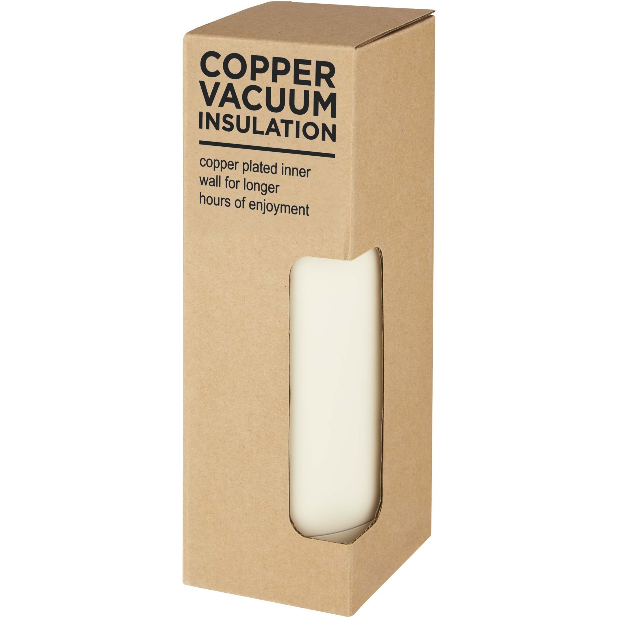 Kupfer-vakuumisolierte Edelstahlflasche mit klarem Design. Die isolierte Konstruktion aus 18/8-Edelstahl verhindert die Bildung von Kondenswasser an der Innenseite der Flasche, und die trendige Pulverbeschichtung macht sie besonders haltbar. BPA-frei, geprüft und zugelassen nach dem deutschen Lebensmittelrecht (LFGB). Auf Phthalate geprüft und zugelassen gemäß den REACH-Vorschriften. Das Fassungsvermögen beträgt 500 ml. Handwäsche empfohlen. Verpackt in einer Geschenkbox aus Recyclingkarton.