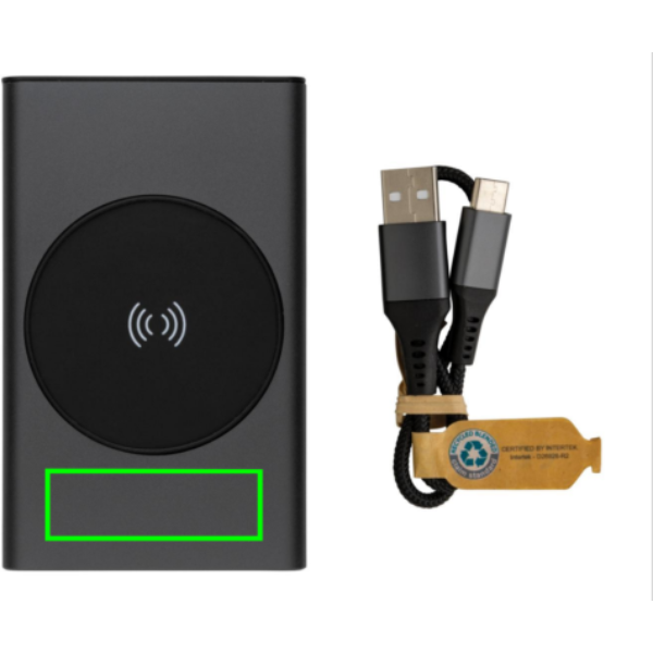 Powerbank aus RCS (Recycled Claim Standard)-zertifiziert recyceltem Aluminium und ABS. Gesamter Recyclinganteil: 31% bezogen auf das Gesamtgewicht des Artikels. Die RCS-Zertifizierung gewährleistet eine vollständig zertifizierte Lieferkette der recycelten Materialien. Aluminium verliert seine Eigenschaften im Recyclingprozess nicht und kann daher endlos recycelt werden. Die Powerbank enthält einen langlebigen A-Grade Lithium-Polymer-Akku dmit 5000mAh. Das kabellose Ladegerät unterstützt kabelloses Laden mit bis zu 5W. Die Ladestandsanzeigen zeigen die verbleibende Energie an, sodass Sie immer wissen, wann Sie wieder aufladen müssen. Artikel und Zubehör 100% PVC-frei. Inklusive Type-C-Ladekabel aus RCS-zertifiziert recyceltem Aluminium, TPE und PET. Verpackt in FSC®-Mix-Verpackung. USB-Input 5/2,4A, Type-C-Output: 5V/2,4A. Type-C Input: 2,4A. Micro-USB-Input: 5V/2A.