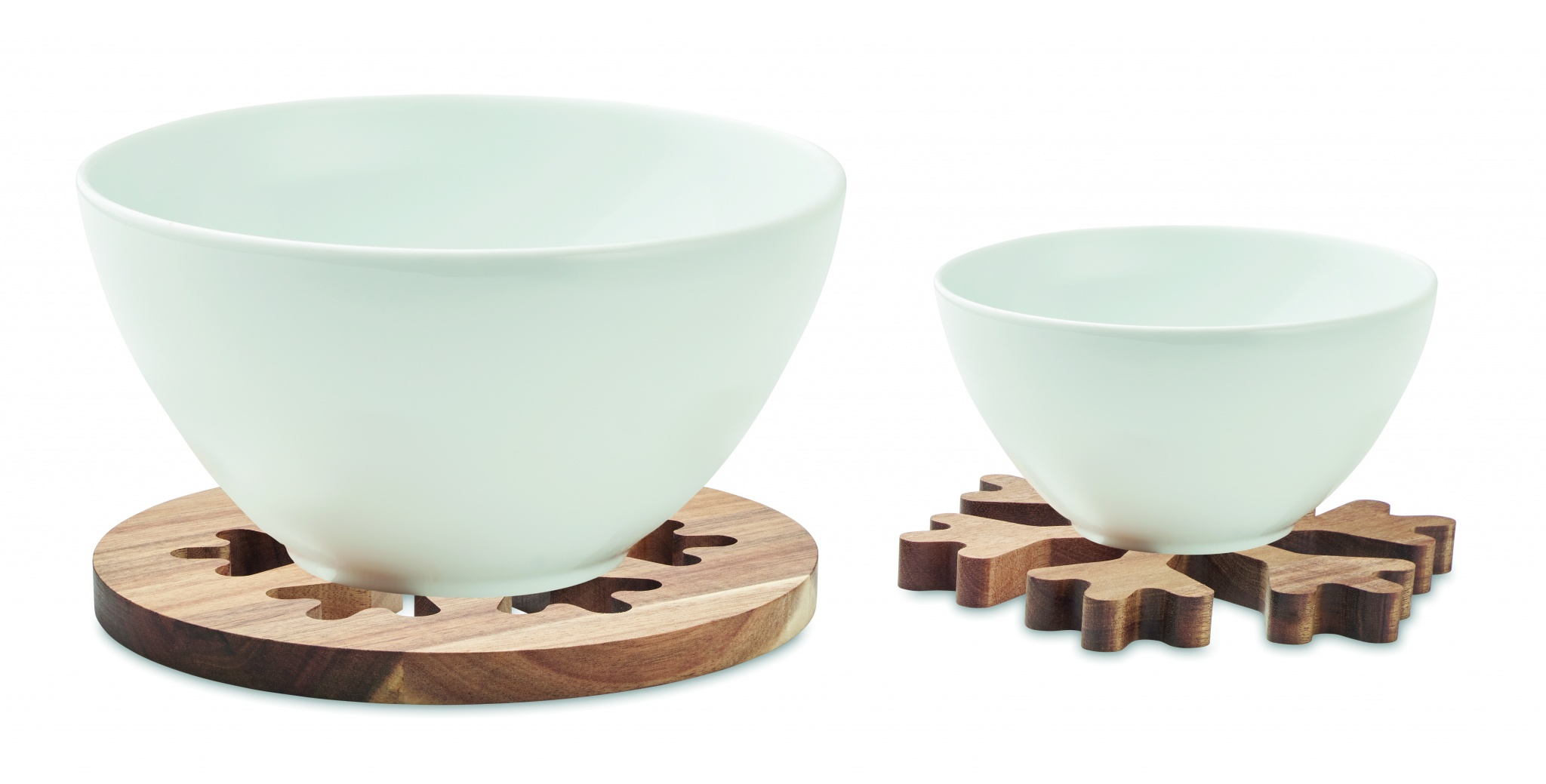 Set mit 2 Topfuntersetzern aus Akazienholz. Motiv: Schneeflocke. Holz ist ein natürliches Produkt, es kann daher zu leichten Abweichungen in Farbe, Dekor und Maßen kommen.