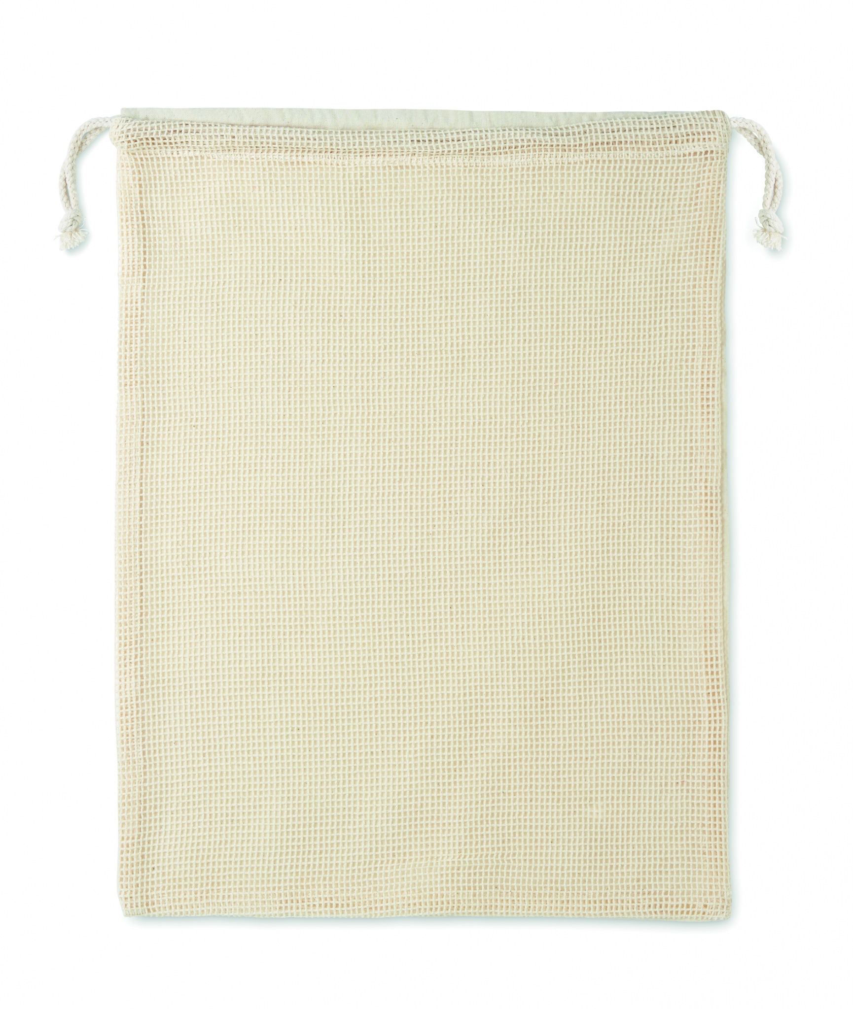 Re-usable food bag. One side is in cotton (140gr/m²) and other one is in mesh cotton (110gr/m²). Drawstring closure.