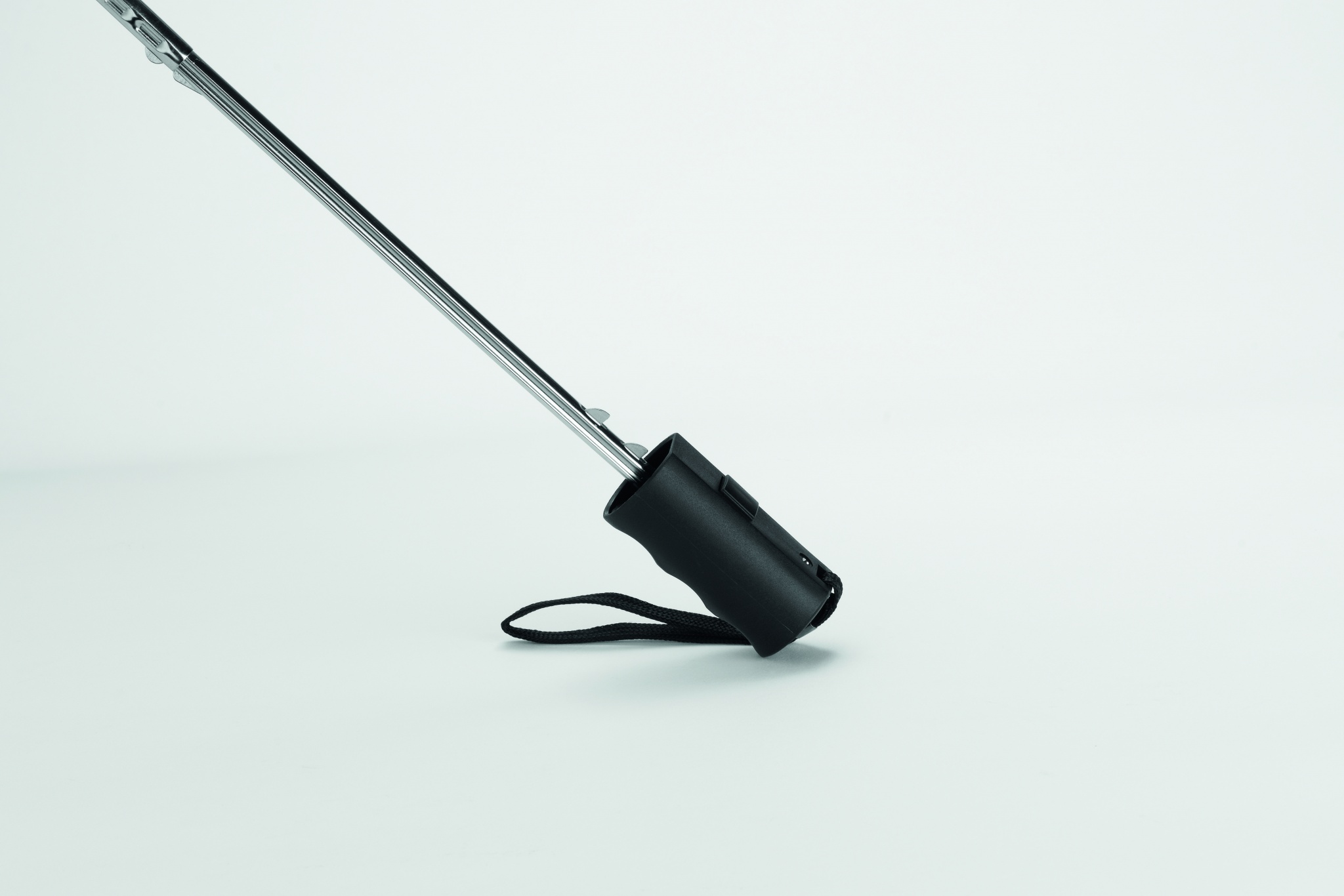 21 inch 2 fold auto open umbrella in 190T pongee with zincify plating steel shaft, ribs and tips. Panels with reflective trim. Black plastic handle with wrist strap. Includes matching pouch with reflective trims. Manual closure.