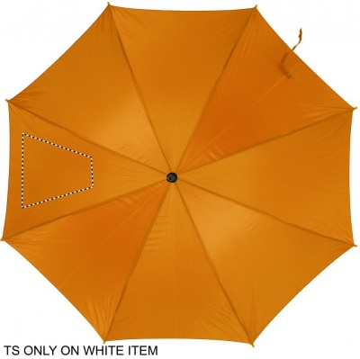 23 inch auto open umbrella in 190T polyester with wooden shaft, tips and top. Black plated metal ribs. Curved natural finish wooden handle.