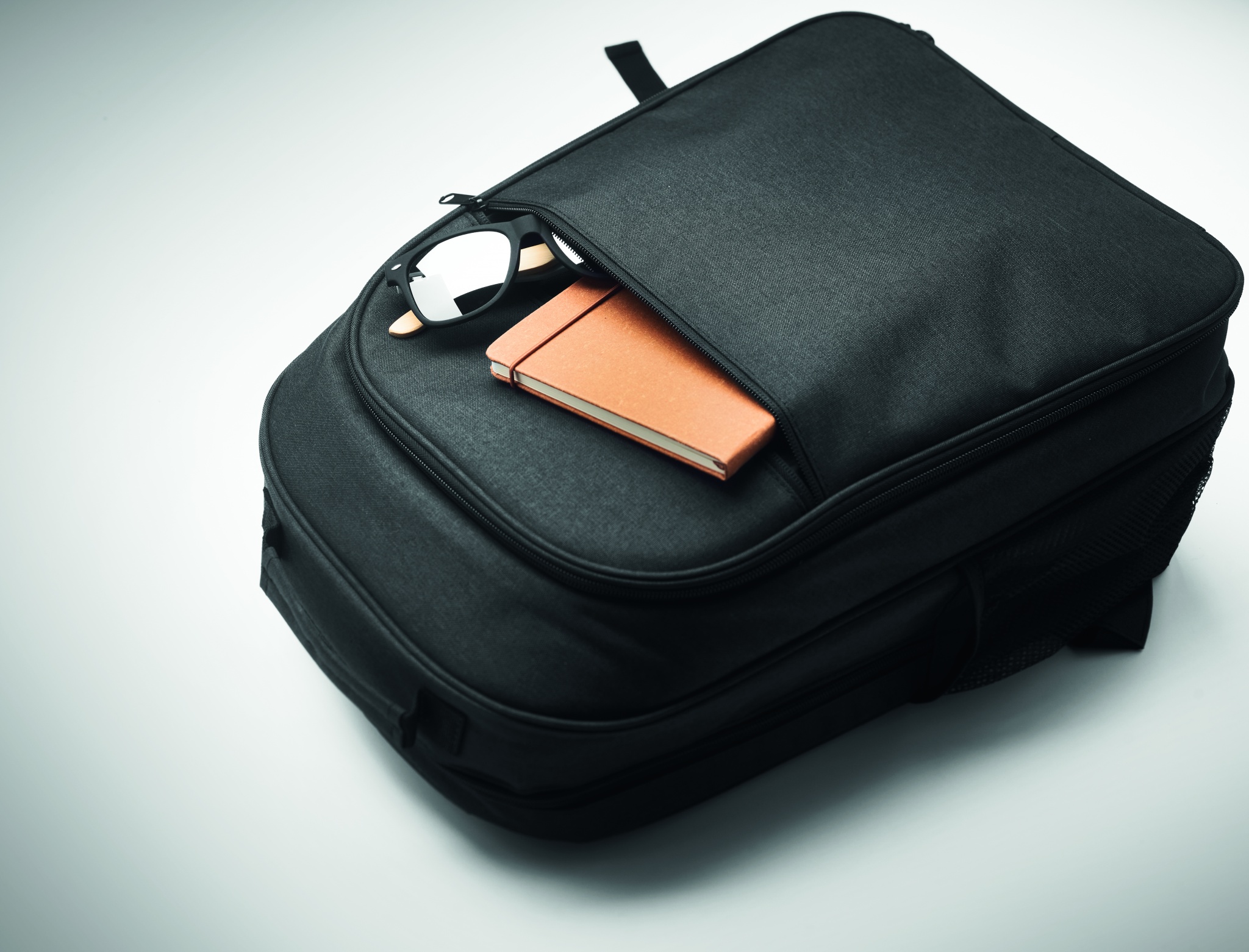 300D RPET cooling backpack with 15 inch laptop compartment. Front zipper pocket and one side mesh compartment.