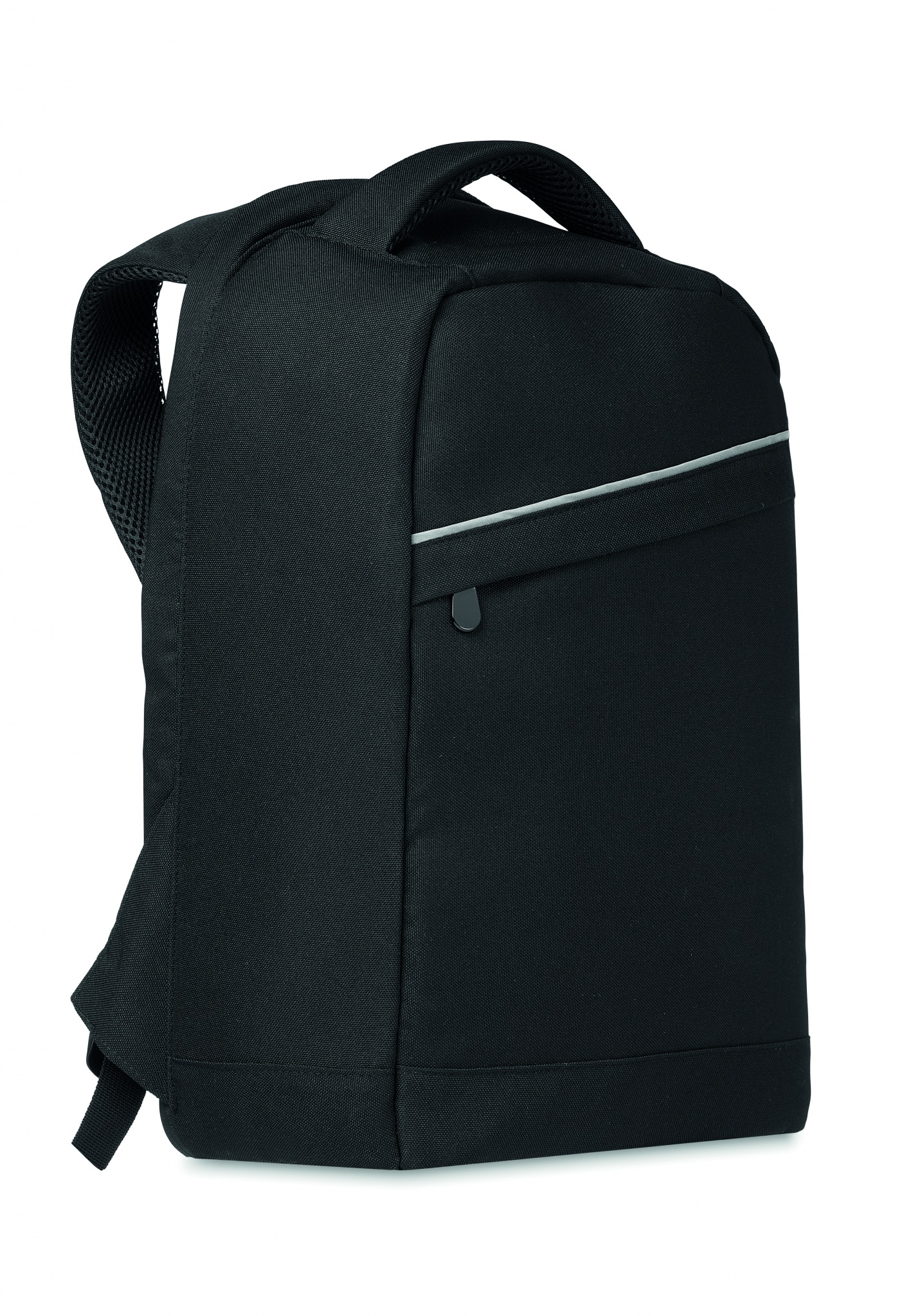 600D RPET backpack with padded shoulder strap with main internal compartment. It has a zippered front pocket. Includes one internal 13 inch laptop compartment. Zipper main compartment on backside for better security.