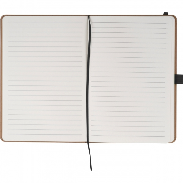 A5 notebook made from recycled paper with 160 lined pages, a bookmark, and a pen loop color-coordinated with the elastic closure band. Your logo is printed on the outside of the cover.
