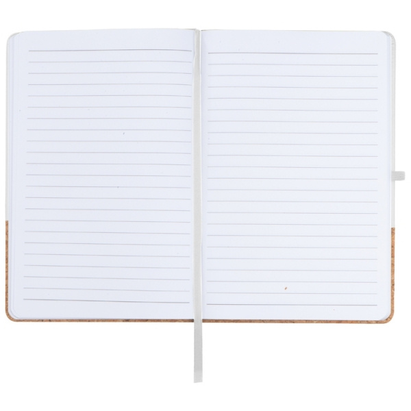 A5 notebook with 160 lined pages and PU cork cover, bookmark, ballpen loop, and elastic closure band. We print your logo on the front.