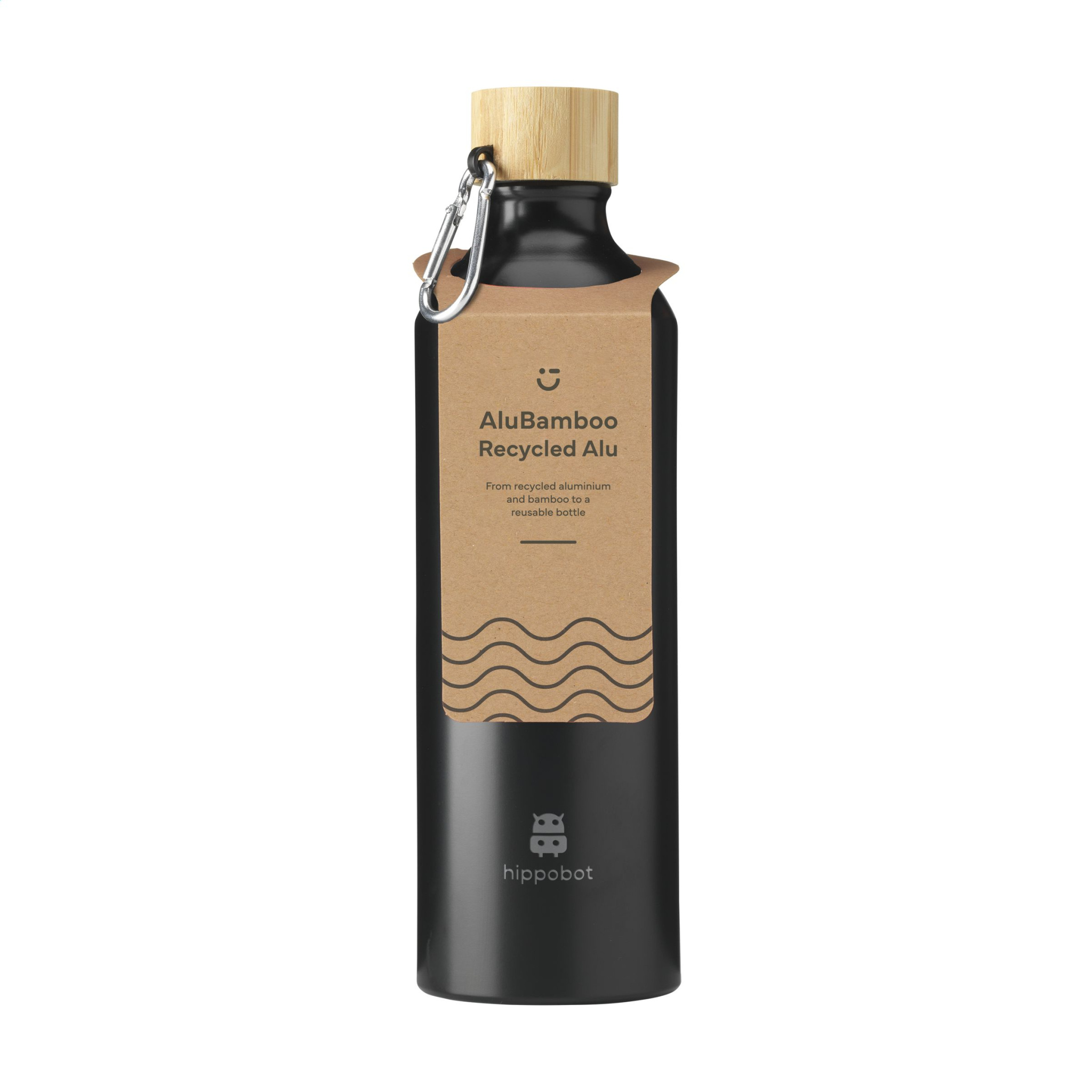 WoW! Single-walled water bottle made from recycled aluminium. With bamboo screw cap and an aluminium carabiner to easily attach the bottle to your bag or backpack. The carabiner is not to be used for climbing. You van take this ideal lightweight bottle with you everywhere. Only suitable for cold water. Leak proof. Not dishwasher-safe. GRS-certified. Total recycled material: 82%. Capacity 750 ml. By using recycled aluminium, fewer new raw materials are used during the production of this product. This means less energy consumption and less use of water. A responsible choice.