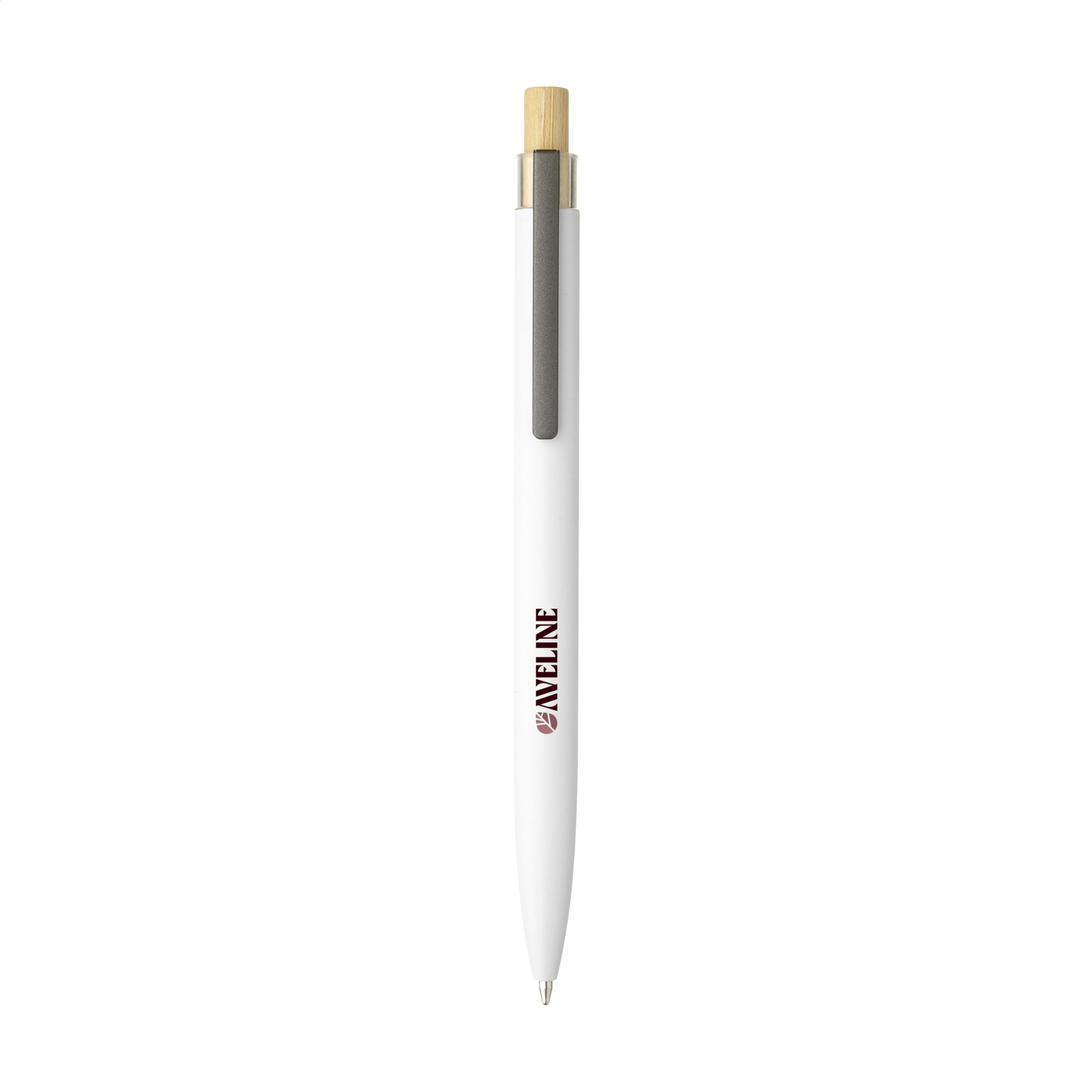 WoW! Fashionable, blue-writing ballpoint pen made from recycled aluminium, with a matte finish. The bamboo push button has a transparent accent. The holder consists of one piece and is standard printed with the 'recycled aluminium logo'. GRS-certified. Total recycled material: 71%. By using recycled aluminium, fewer new raw materials are used during the production of this product. This means less energy consumption and less use of water. A responsible choice.