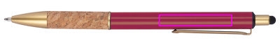 Metal ball pen with golden applications, blue-writing refill and cork grip zone. Your logo will be engraved to the right of the clip.