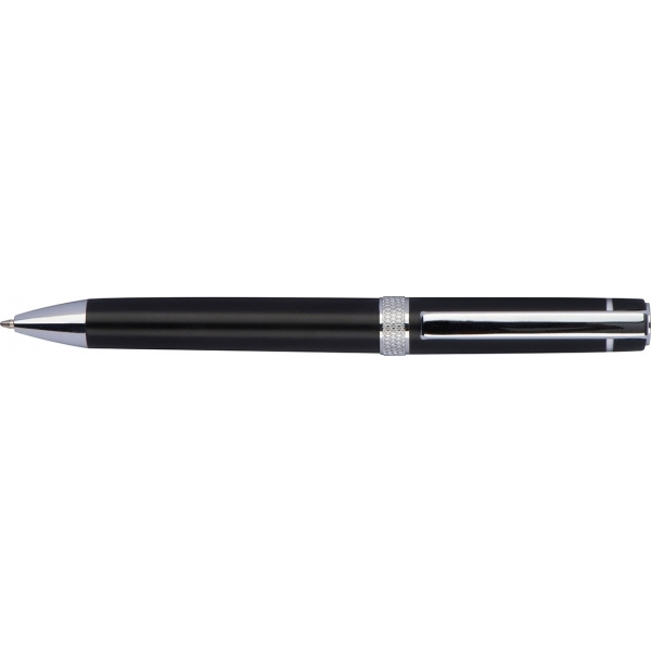 Twist action ballpoint pen made of aluminum with blue writing system refill. The chrome-plated applications and the sparkling decorative ring give the pen its special look. Your logo is engraved on the right side of the clip.