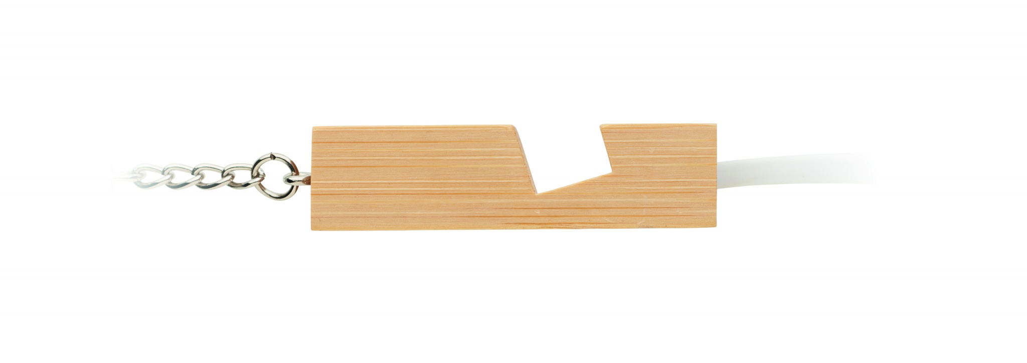 Bamboo key ring with phone stand functionality and integrated charging cable. Input: 2-in-1 Type-C <(>&<)> Type-A. Output: Type-C and micro-B (2 in 1 pin).