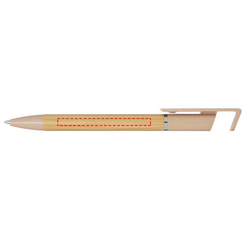 Bamboo ballpoint pen that also functions as a phone holder. The button and mid ring are made of recycled plastic, the tip is made of brass, and the barrel is made of responsibly sourced bamboo. Ink colour: Blue. Writing length: 1000 metres. Nib size: 1.0 mm.