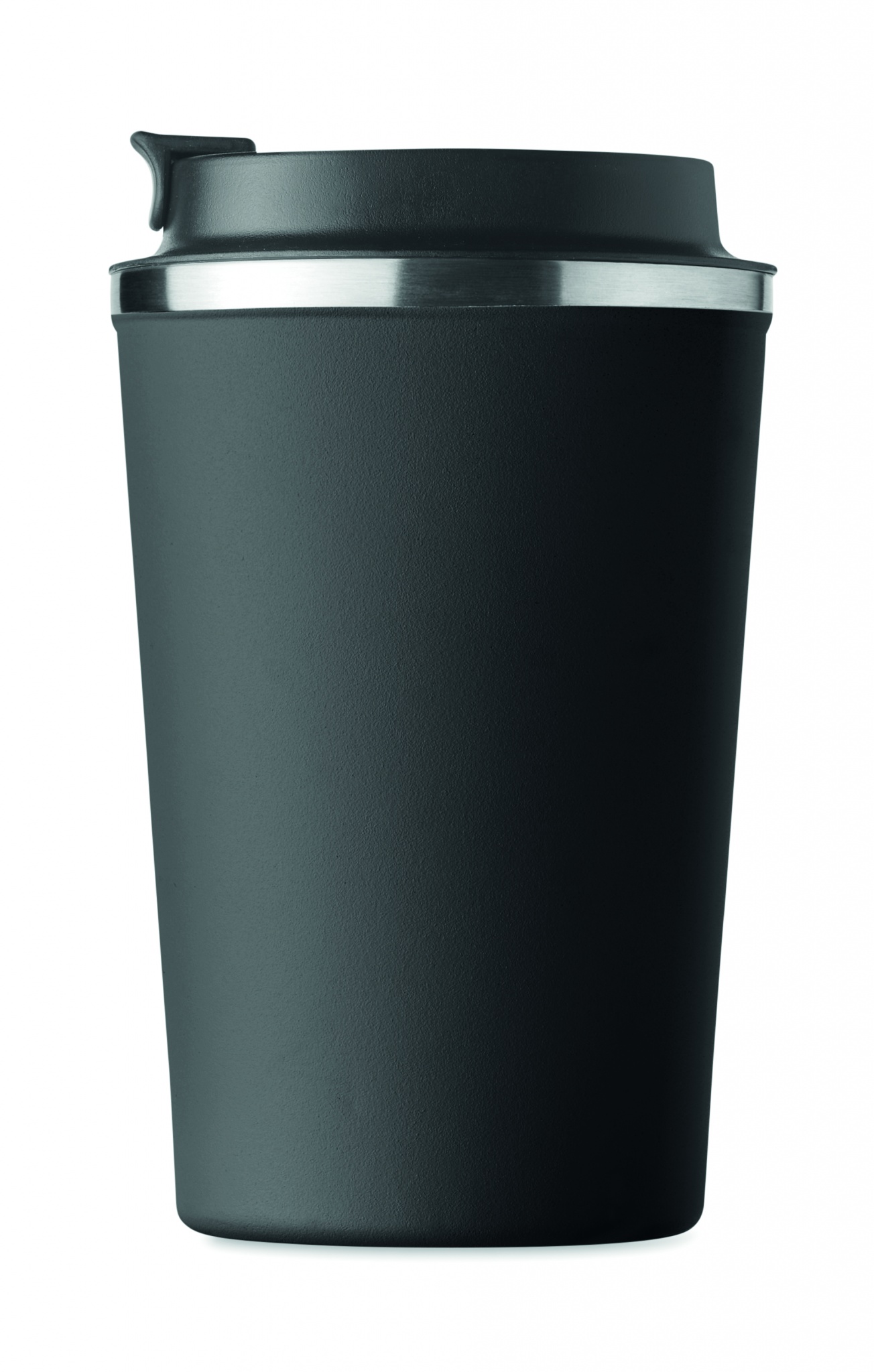 Double wall stainless steel tumbler with PP lid. Capacity: 350 ml. Leak free.