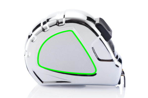 ABS chrome plated case with matt yellow metal tape, ECII and stamped. Black stop button and strap plus stainless steel clip.