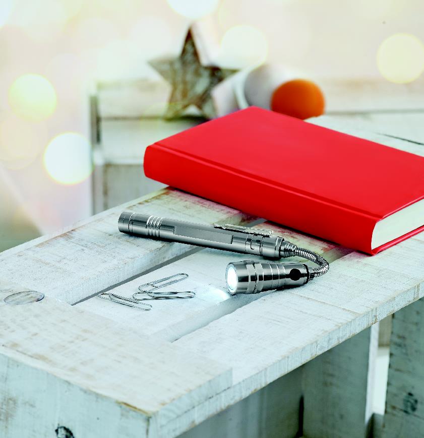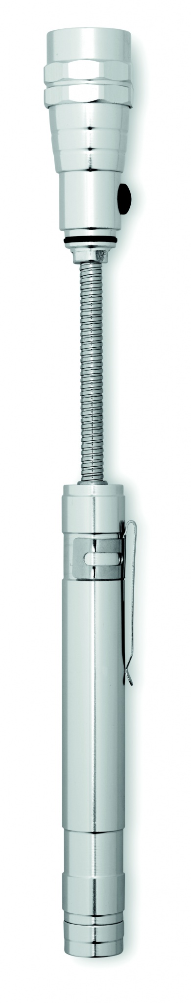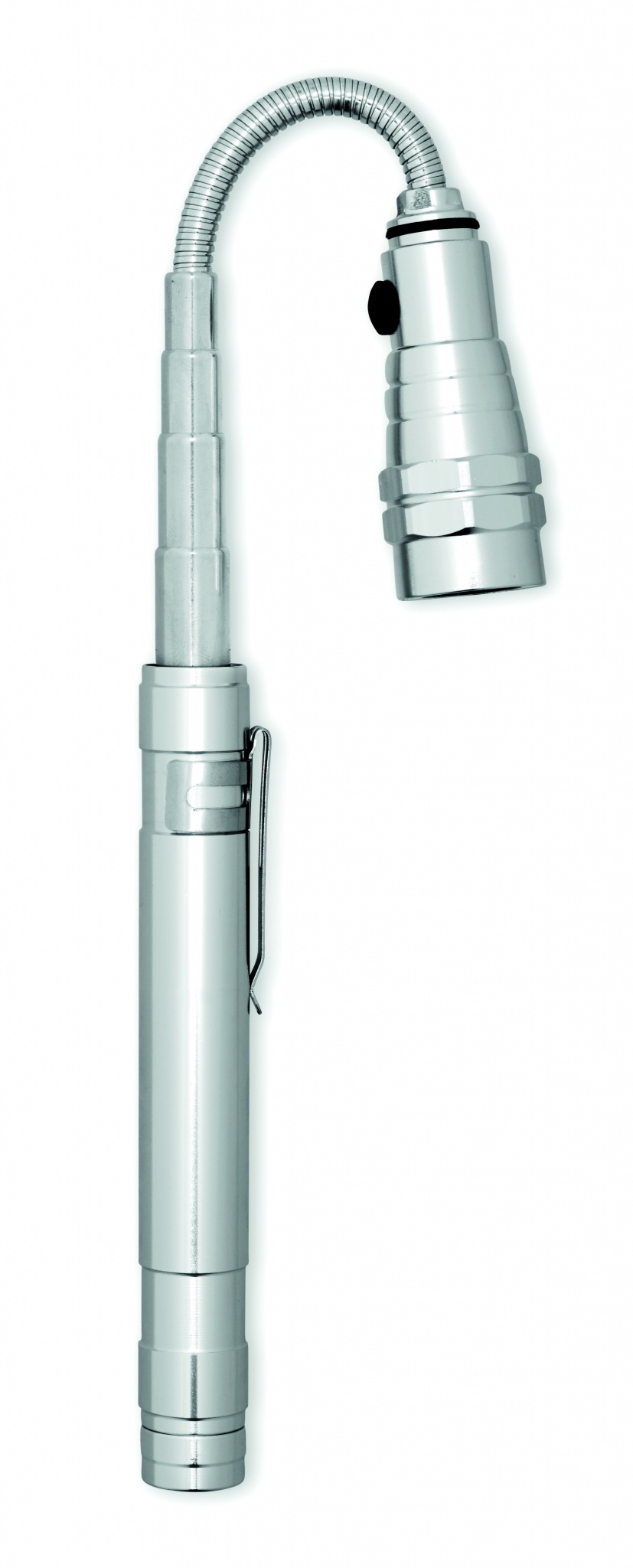 Extendable aluminium torch with 3 LED light and magnet on top and clip on side. 4 Batteries LR44 included. Maximum length 57 cm.