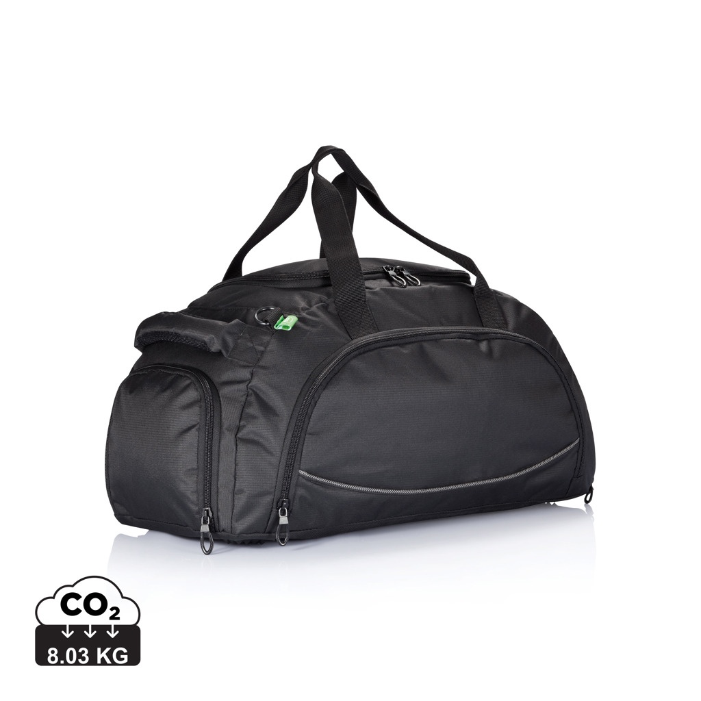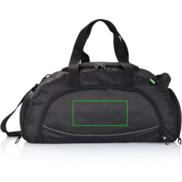 600D ripstop, zippered front pocket with organisers inside, side pocket, shoe pocket, webbing handles and shoulder strap, 4 stand feet on base, PVC free.