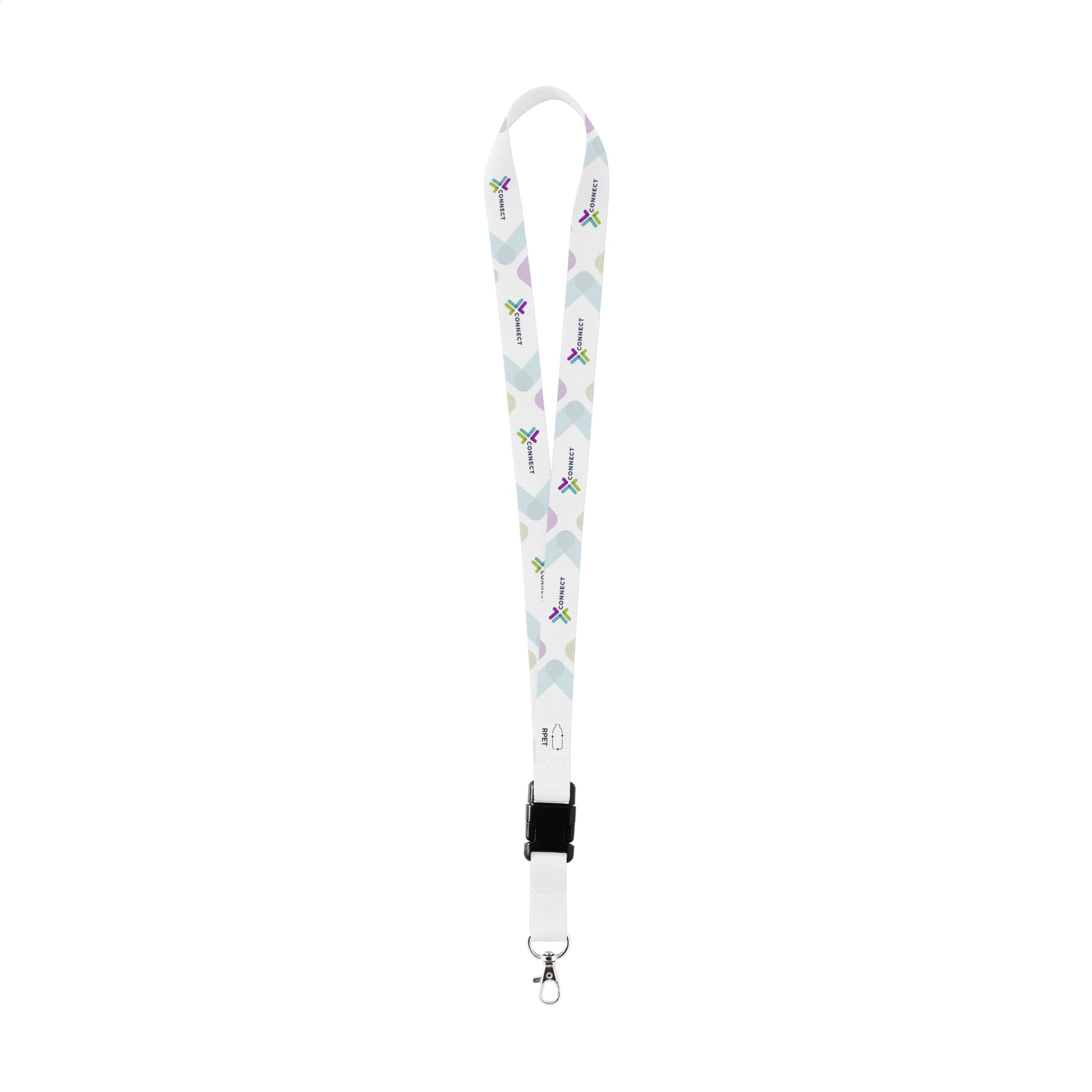 Strong woven RPET polyester lanyard. Supplied with a metal carabiner. The lower part of this product can be disconnected via a plastic buckle. Including full-colour sublimation print. Made in Europe.