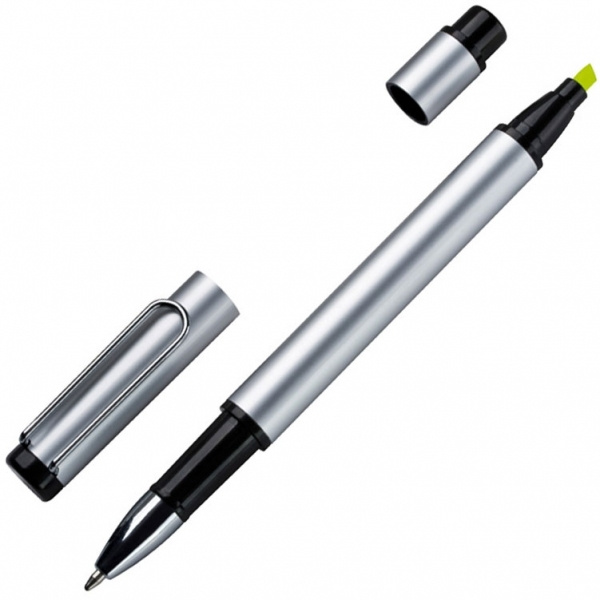 Aluminum ballpoint pen with black-writing refill and yellow highlighter on the opposite side. We engrave your logo on the shaft.