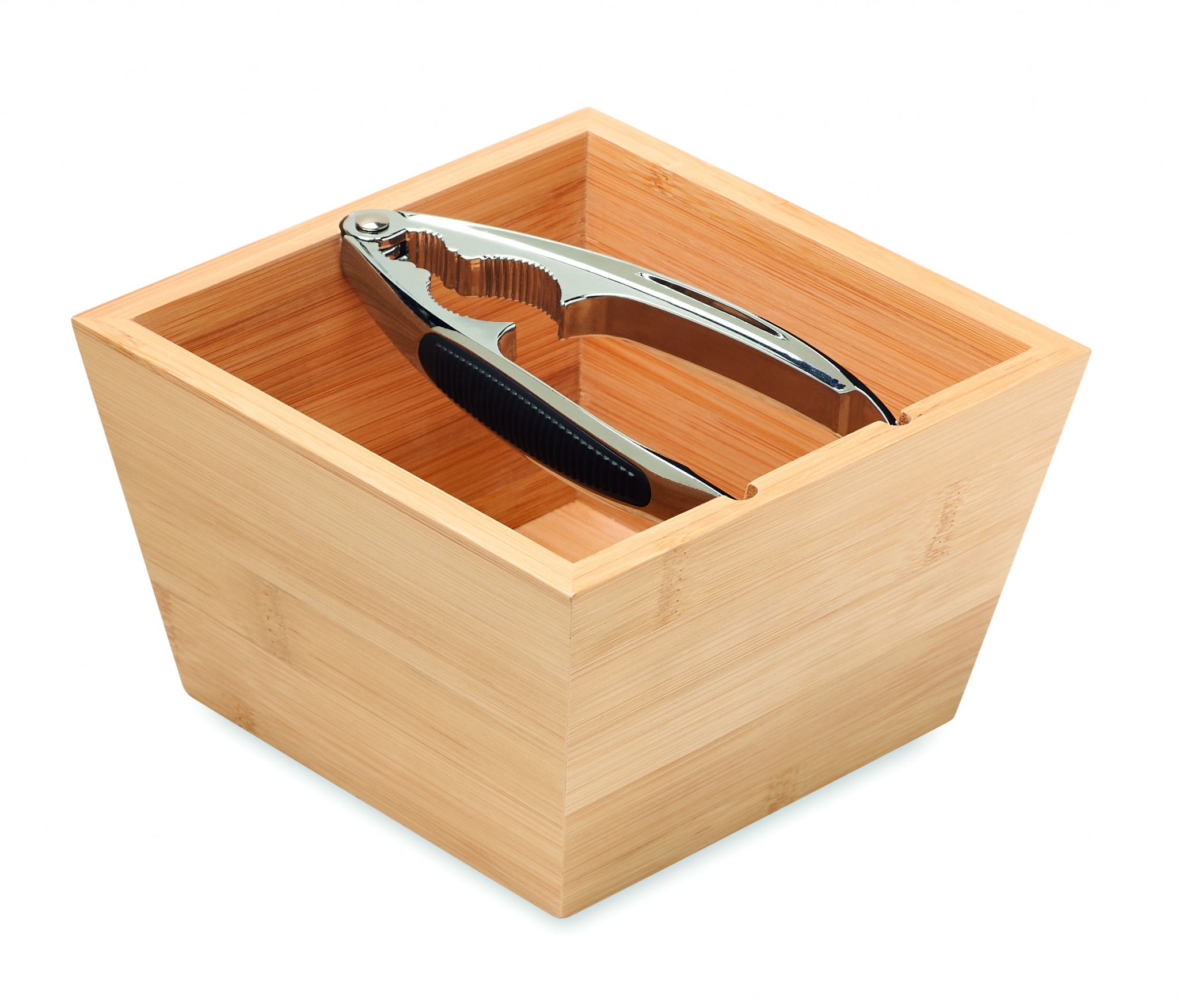 Nut cracker set with bamboo bowl and silver coloured nut cracker in zinc alloy with TPR grip. Bamboo is a natural product, there may be slight variations in colour and size per item, which can affect the final decoration outcome.