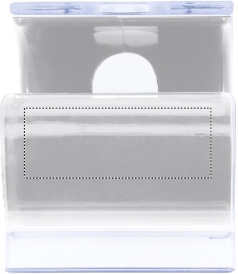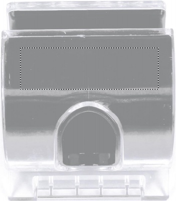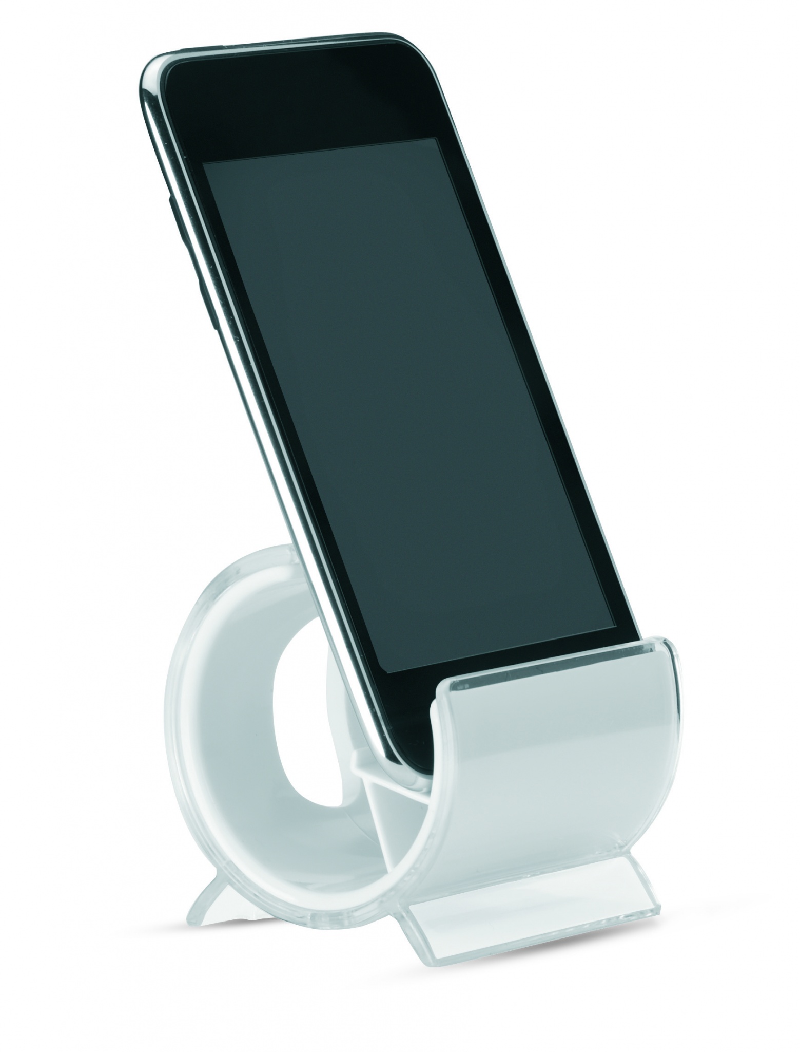 Mobile phone stand in plastic covered by transparent plastic layer.