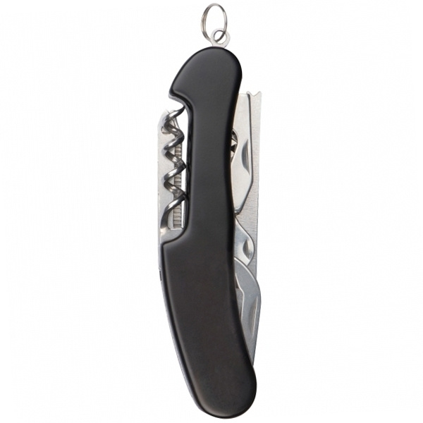 14-piece pocket knife made of stainless steel consisting of: can opener, scissors, fish hook remover, fish scaler, saw knife, knife, slot screwdriver, can opener, key ring, corkscrew, nail file, reamer and Phillips screwdriver. We engrave your logo on the knife.