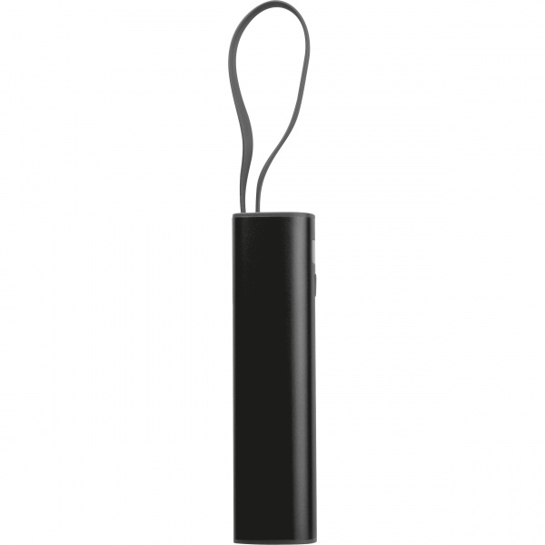 Power bank made of aluminum with a 5,000 mAh Li-ion battery, charge level display, and integrated USB-C charging cable. A 30 cm Type-A to Type-C charging cable is included. Your logo is applied below the display using laser engraving.