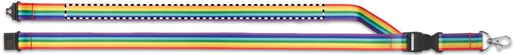 Rainbow RPET lanyard with metal hook, detachable buckle and safety breakaway.