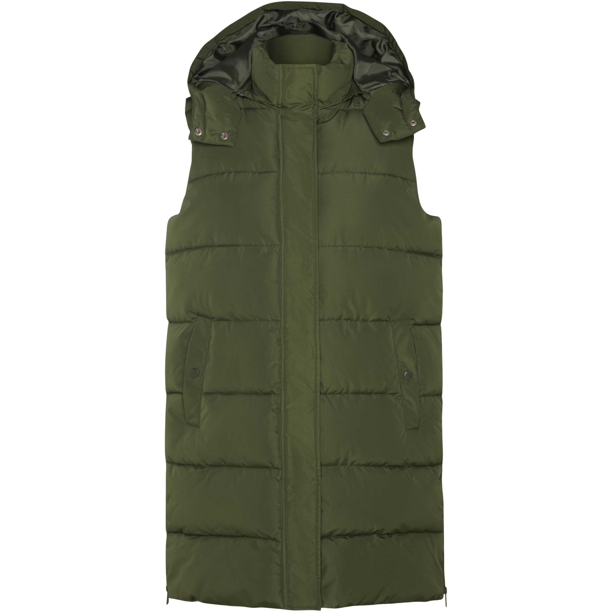 Padded bodywarmer with removable hood. High collar. Front zip closure hidden by flap. Two pockets with snap button closure. Side openings with zippers. Interior chest access. Water repellent.