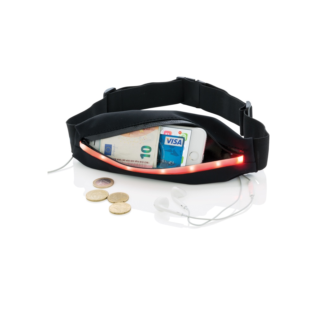 Running holder constructed from an elastic water repellent material with waterproof zipper. With integrated safety light for good visibility when working out in the dark. The light has 3 modes that can be set to each users personal preference. With adjustable buckle to fit all sizes. Including battery for direct usage.
