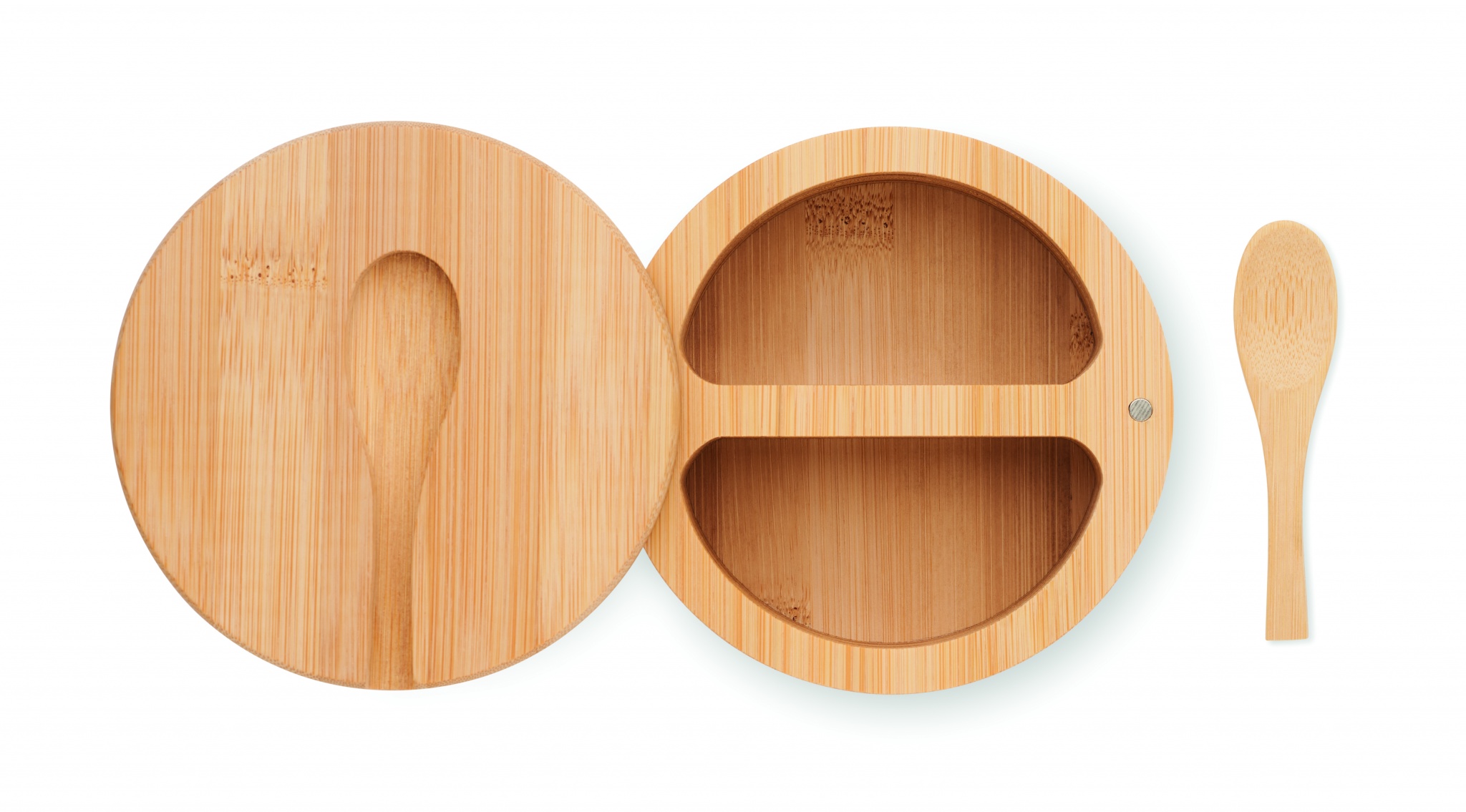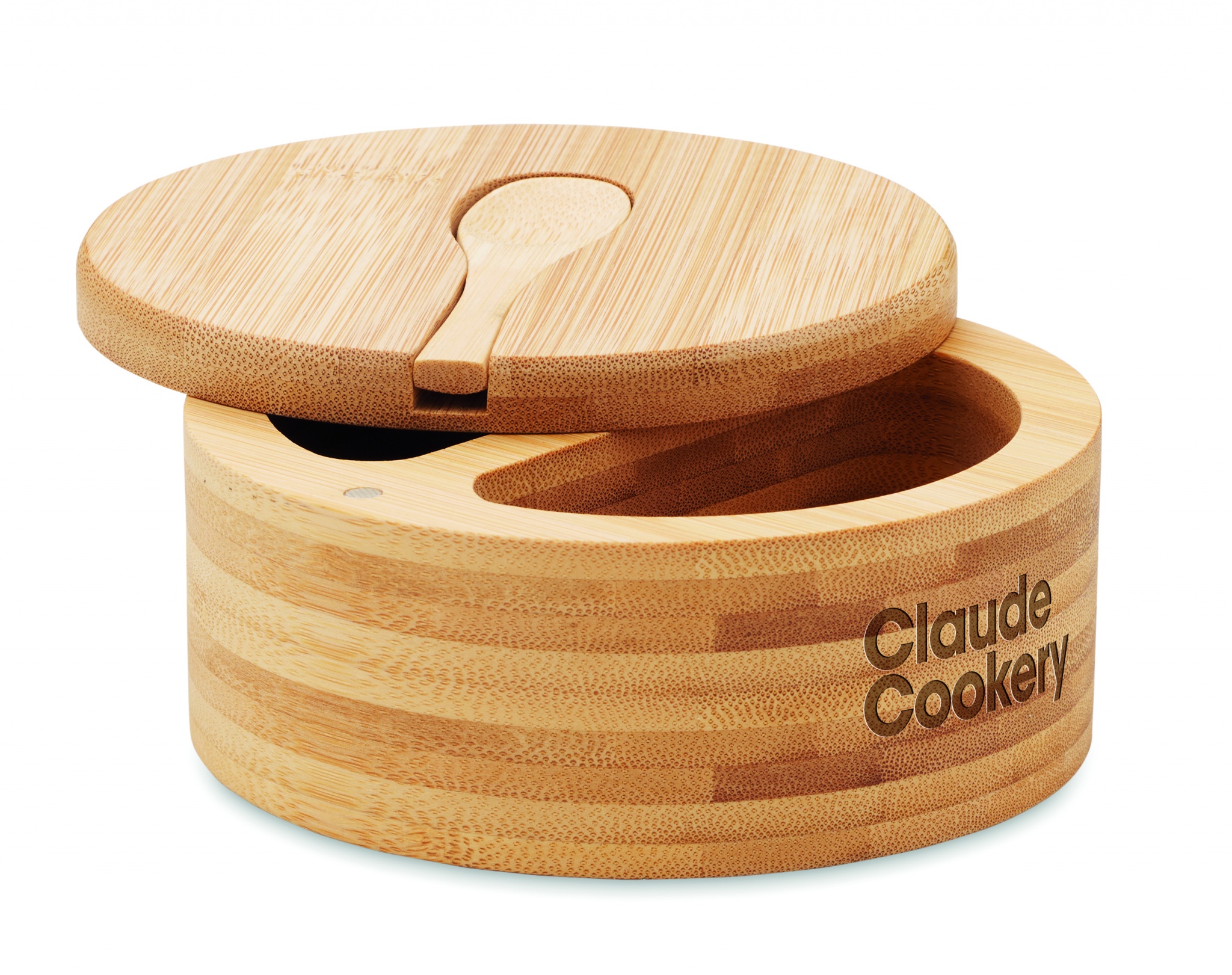 Salt and pepper box in bamboo with built in serving spoon. Two compartments. Twist opening lid. Bamboo is a natural product, there may be slight variations in colour and size per item, which can affect the final decoration outcome.