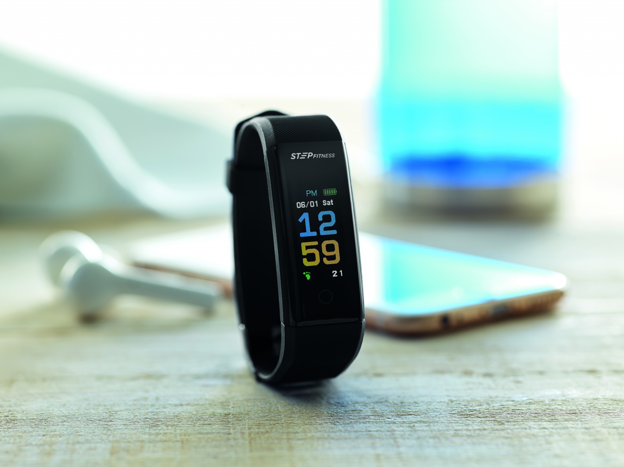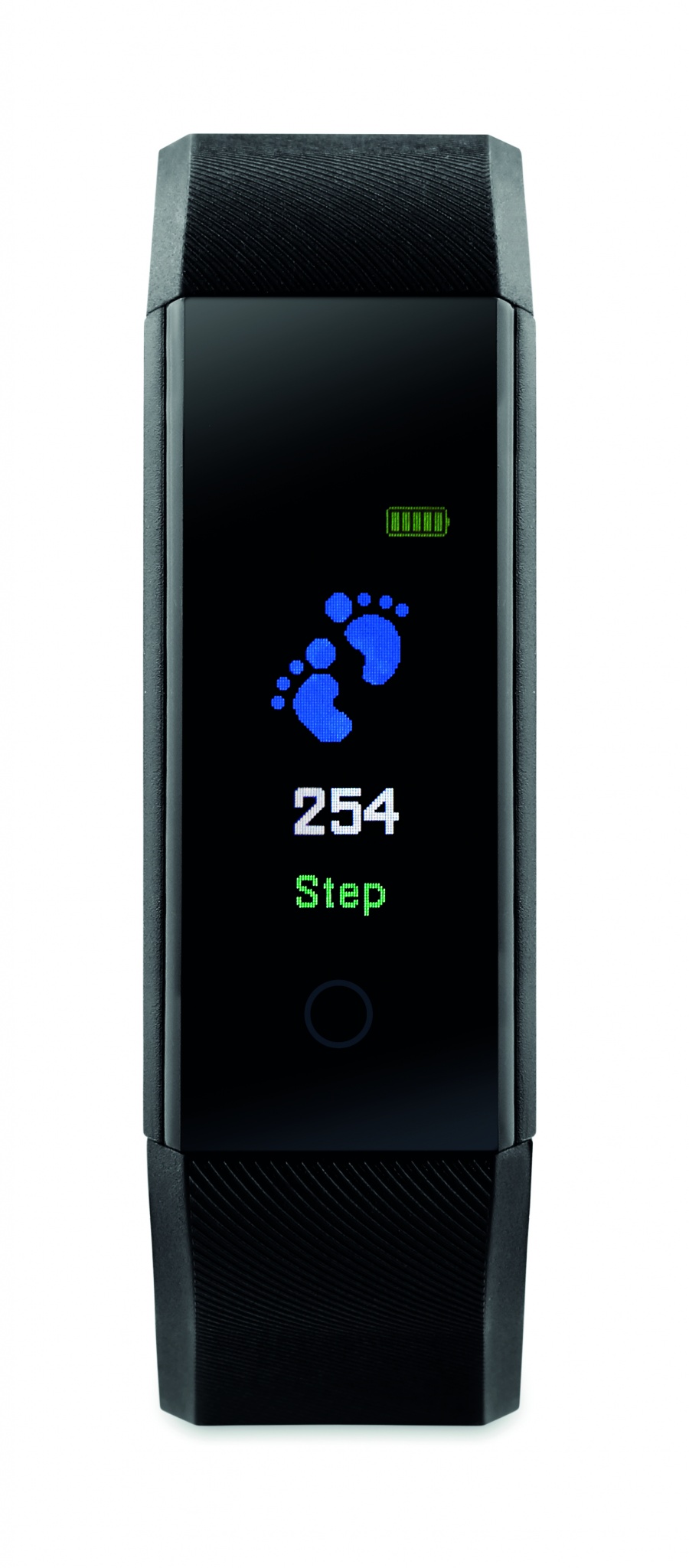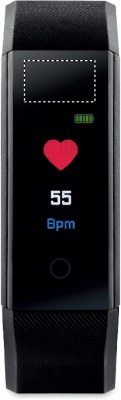 4.0 wireless Low-Energy Smart health watch with TPU detachable strap (for charging). Rechargeable Li-pol 90 mAh battery. Requires a free app (Yoho Sport) available in both iOS and Android.