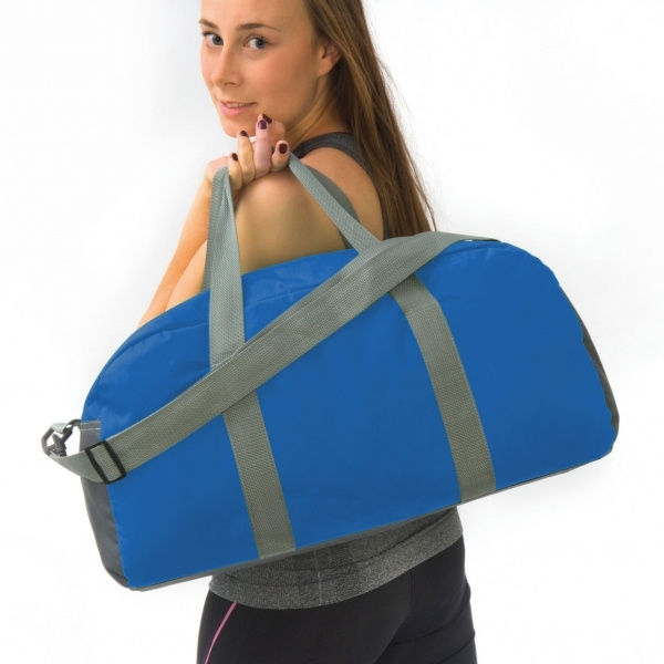 Large 600D polyester sports bag with large inner compartment, carrying handles, and adjustable shoulder strap. We print your logo on one side.
