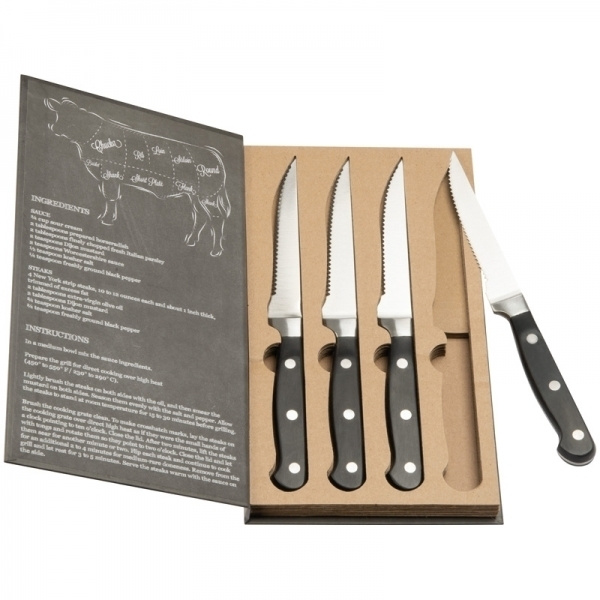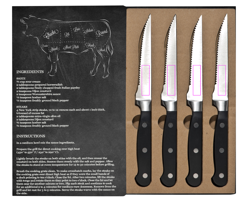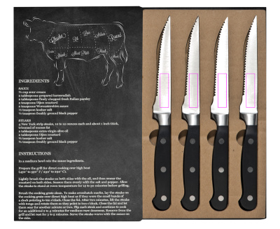 Story of meat! For the perfect steak you need the perfect knifes, otherwise your steak will look more or less like minced. This steak knife set is made of stainless steel and the quality is just awesome. The packing will make the set even better. We will pad print your logo onto the packing.