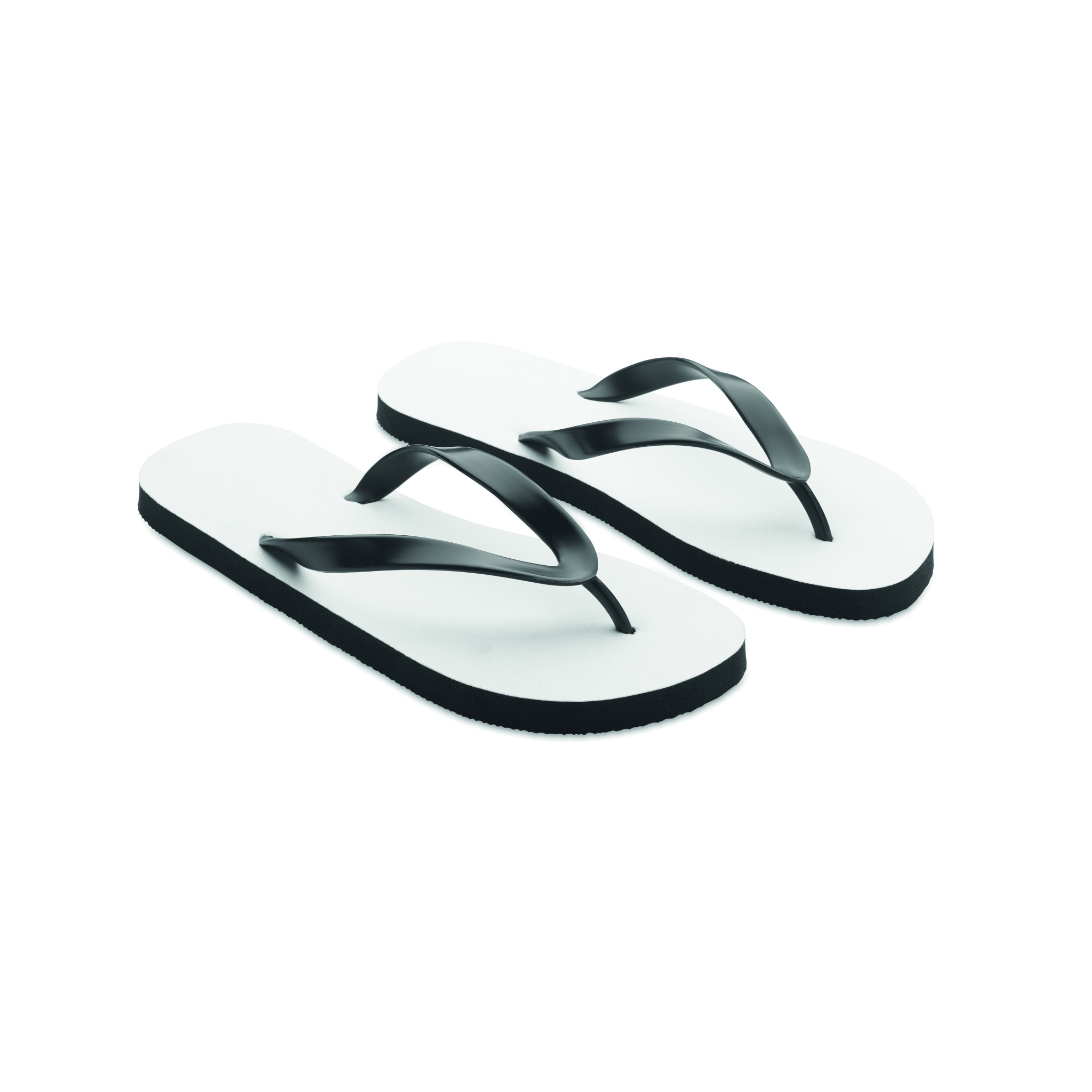 Sublimation beach slippers with PVC straps. Sole made of rubber with polyester top cloth.Fits 38-41. Item can only be ordered printed.