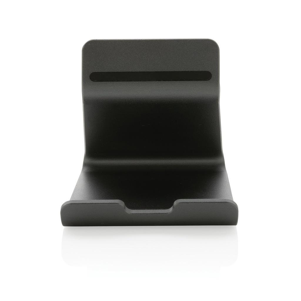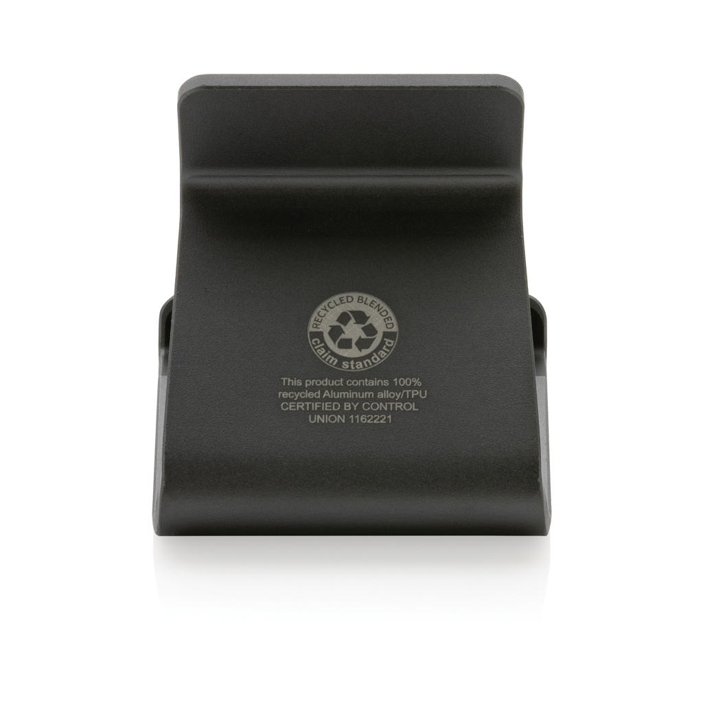Aluminium phone stand made with RCS (Recycled Claim Standard) certified recycled aluminium and TPU. Total recycled content: 100% based on total item weight. RCS certification ensures a completely certified supply chain of the recycled materials. Aluminium does not lose its characteristics in the recycling process and can be recycled endlessly. Compatible with all phone sizes and tablets. Packed in FSC® mix packaging.