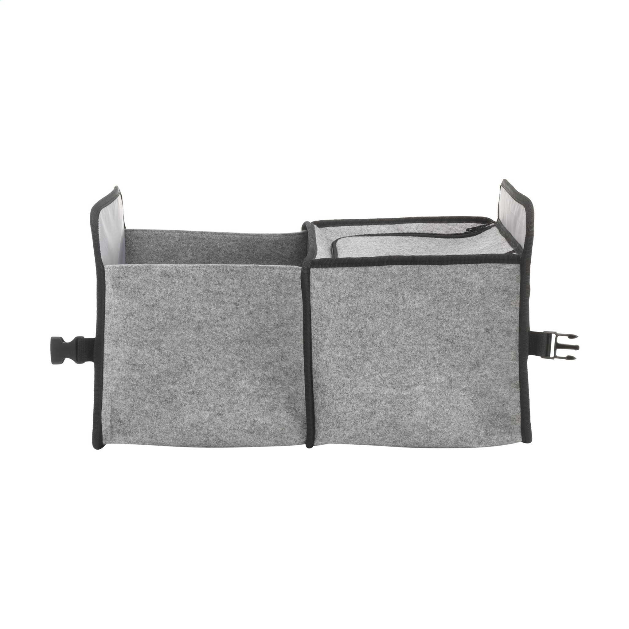 WoW! Practical, foldable organiser with cooling compartment designed for the boot of a car. Made from sturdy RPET felt. The main storage compartment is fitted with a base plate and a spacious lockable cooling compartment. A front pocket and mesh side pocket provide extra storage space. The organiser compartment is perfect for storing a number of smaller items and the cool storage compartment is ideal for transporting chilled food. Meas. expanded 31 x 28 x 48 cm. Meas. folded 31 x 28 x 6 cm. Capacity approx. 41 litres. GRS-certified. Total recycled material: 56%.
