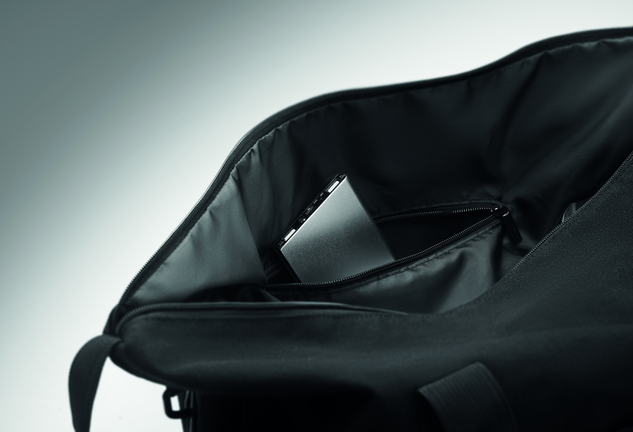 Weekend bag in recycled pre-consumer cotton and recycled polyester (70%/30%) with lining 210D RPET polyester. It has a front slip pocket, zippered back pocket a removable and adjustable shoulder strap and padded bottom. Trolley holder on reverse side.