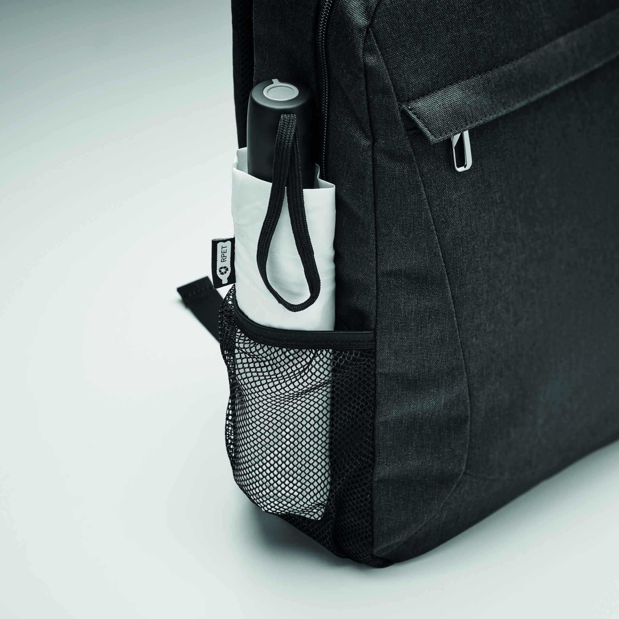 15-tolline sülearvuti seljakott 600D RPET polüestrist. Sisemine sülearvuti sahtel ja mitu väikest sisemist sahtlit. Sellel on lukuga eesmine tasku ja 2 külgmist võrktaskut. Reguleeritavad õlarihmad. Käru hoidik tagaküljel.