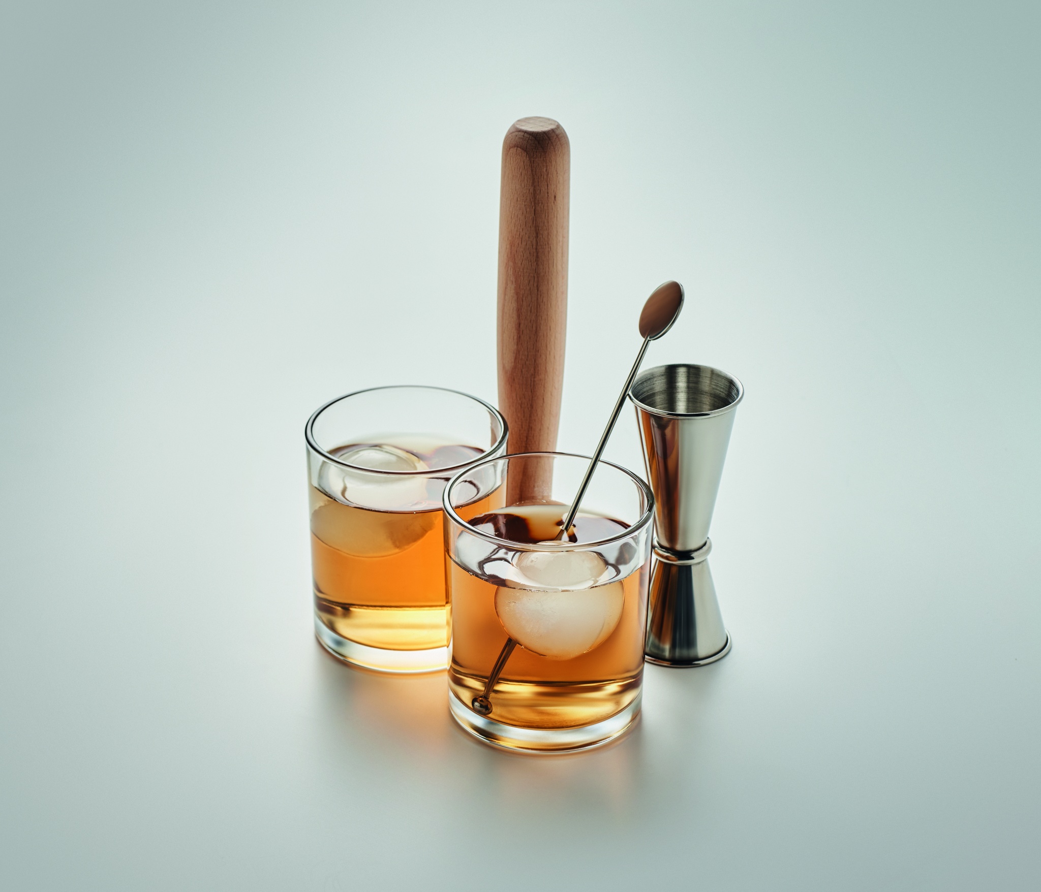 Kokteiliklaasi komplekt. Sisaldab 7 tükki: kaks trumlit, kahepoolne roostevabast terasest jigger (25&50 ml), puidust segaja, roostevabast terasest joogisegaja ja kaks kerakujulist silikoonist jäävormi.