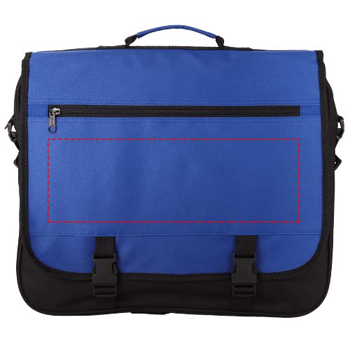 Reguleeritava õlarihmaga näitusekott, pandlaga suletav klapp, tõmblukuga tasku klapil, lukuga põhisahtel ja mitmed avatud taskud klapi all.