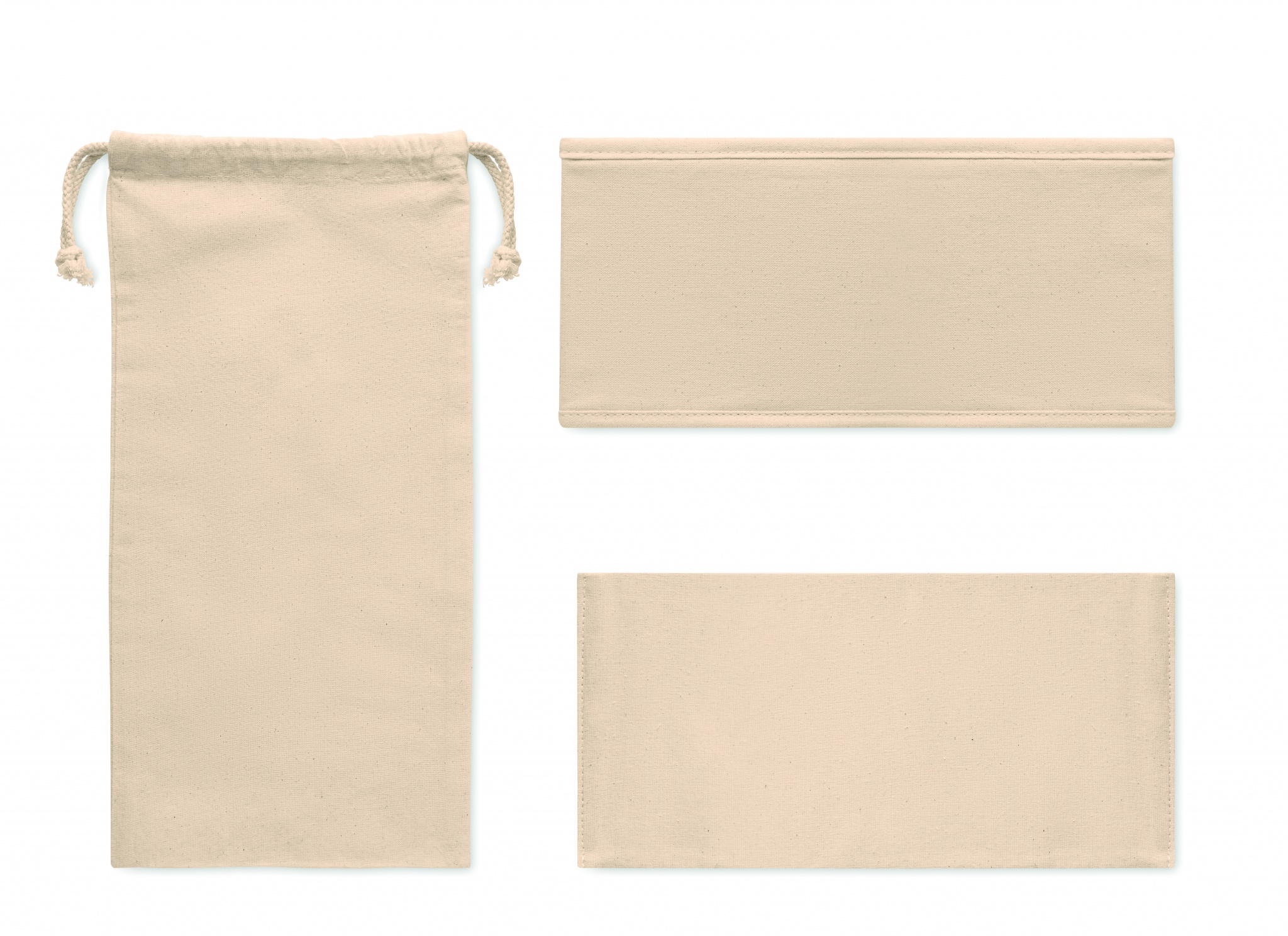 Keskmiselt kokkupandavad tarvikud või puuvillane hoiukarp (220 gr/m²). Pakutakse puuvillases (140 gr/m²) nööriga kotikeses.