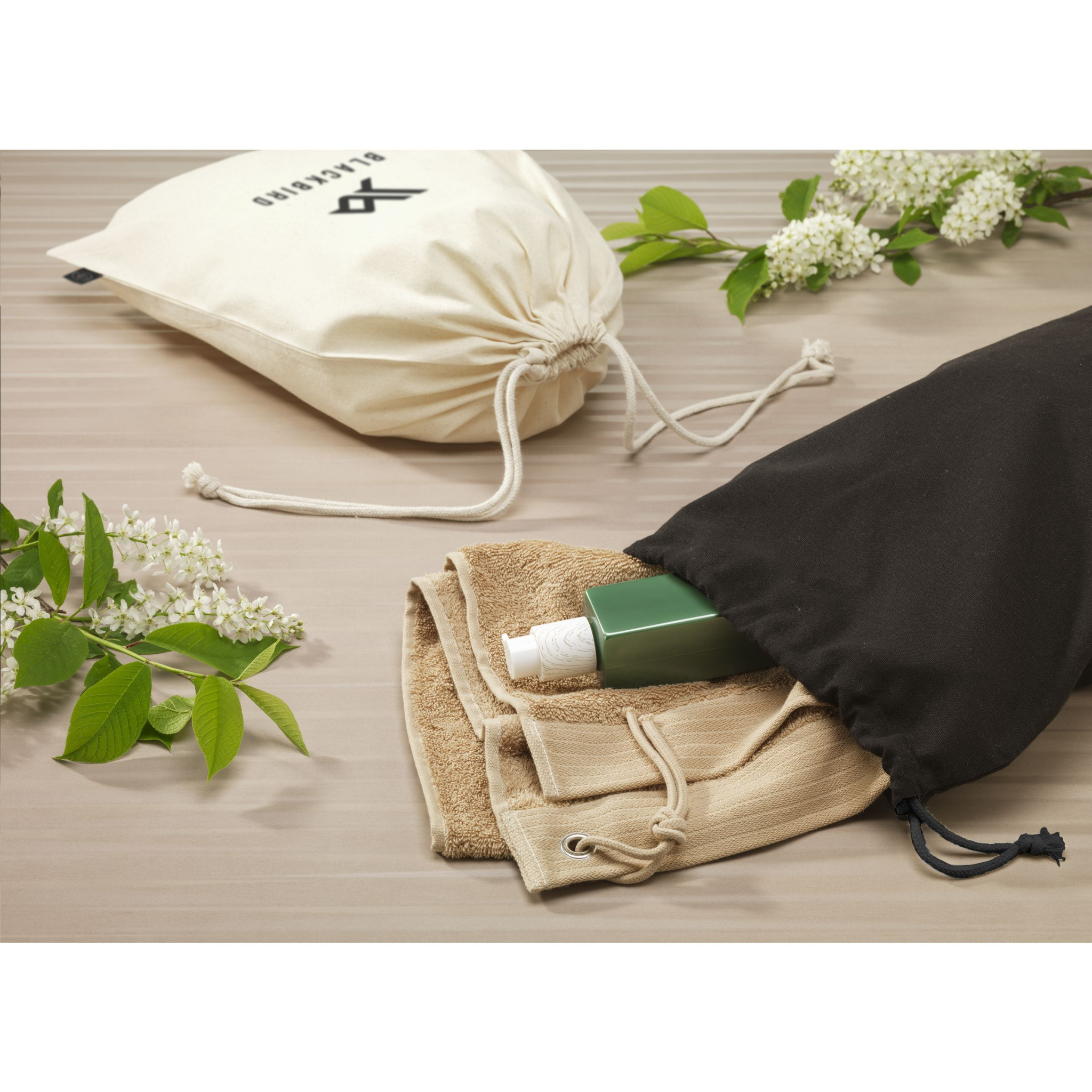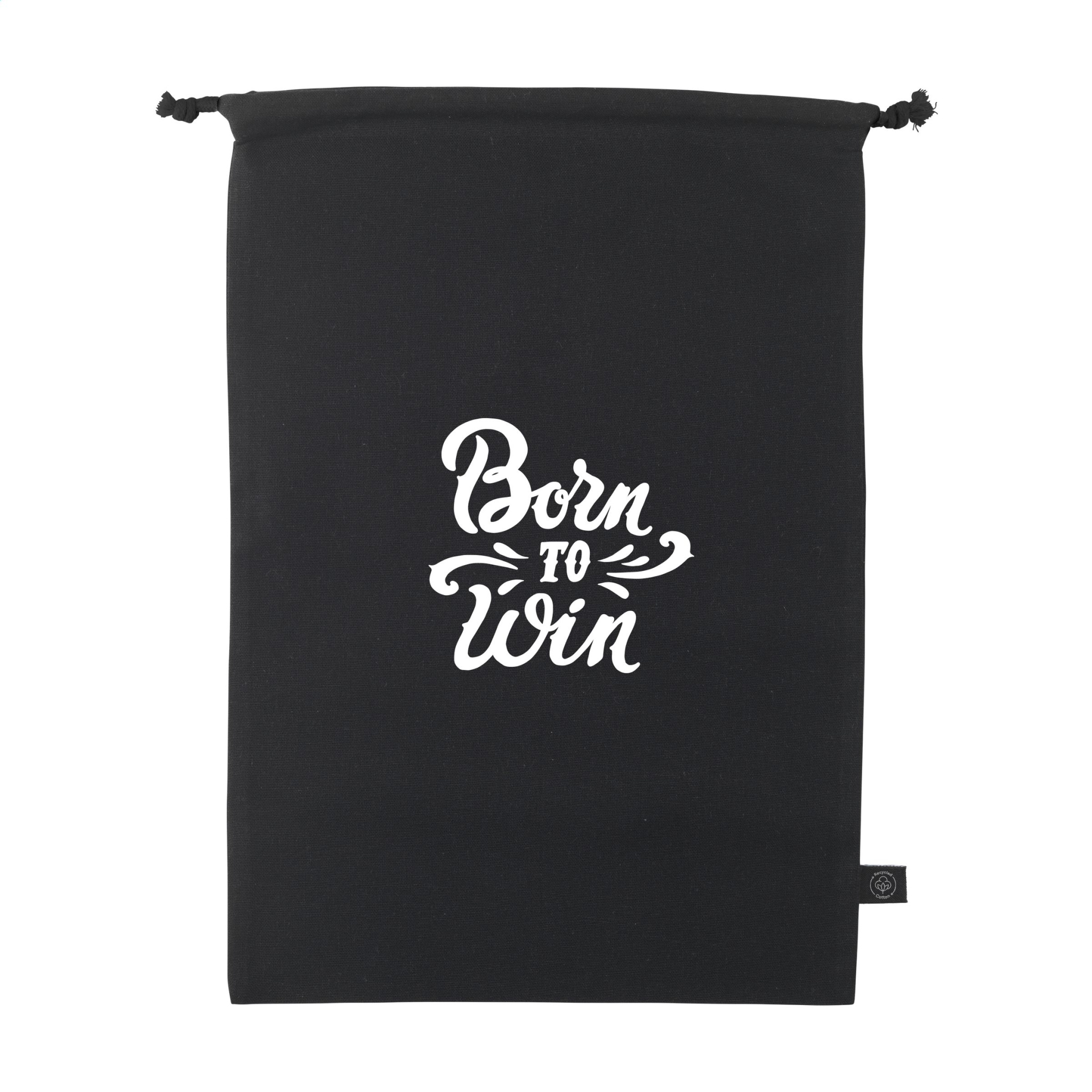 Taaskasutatud puuvillast kinkekott (150 g/m²). Taaskasutatud polüestrist ja taaskasutatud puuvillast valmistatud pingutusnööridega. Originaal kinkepakendiks ja sobib esemete hoiustamiseks. GRS-sertifikaadiga. Kokku taaskasutatud materjal: 100%. Mahutavus ca. 4 liitrit.