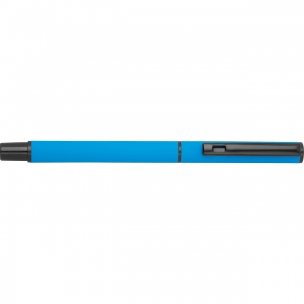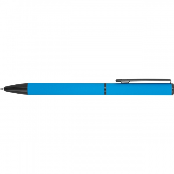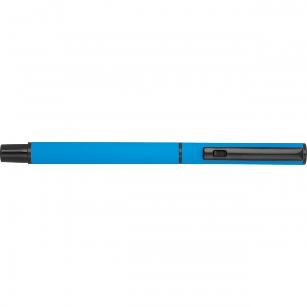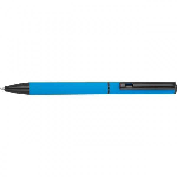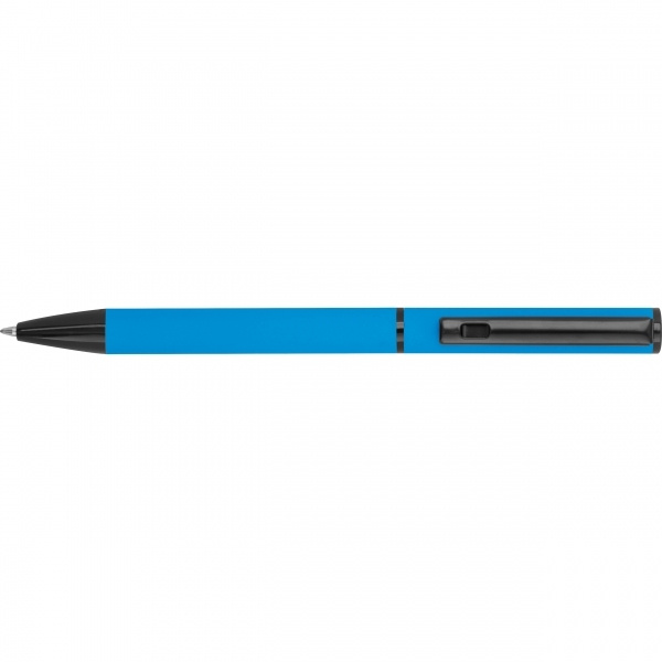 Helesinine kirjutuskomplekt, mis koosneb musta tindiga pastapliiatsist ja sinise tindiga keeratavast pastapliiatsist, pakendatud karpi. Teie logo graveeritakse kirjutusvahenditele.