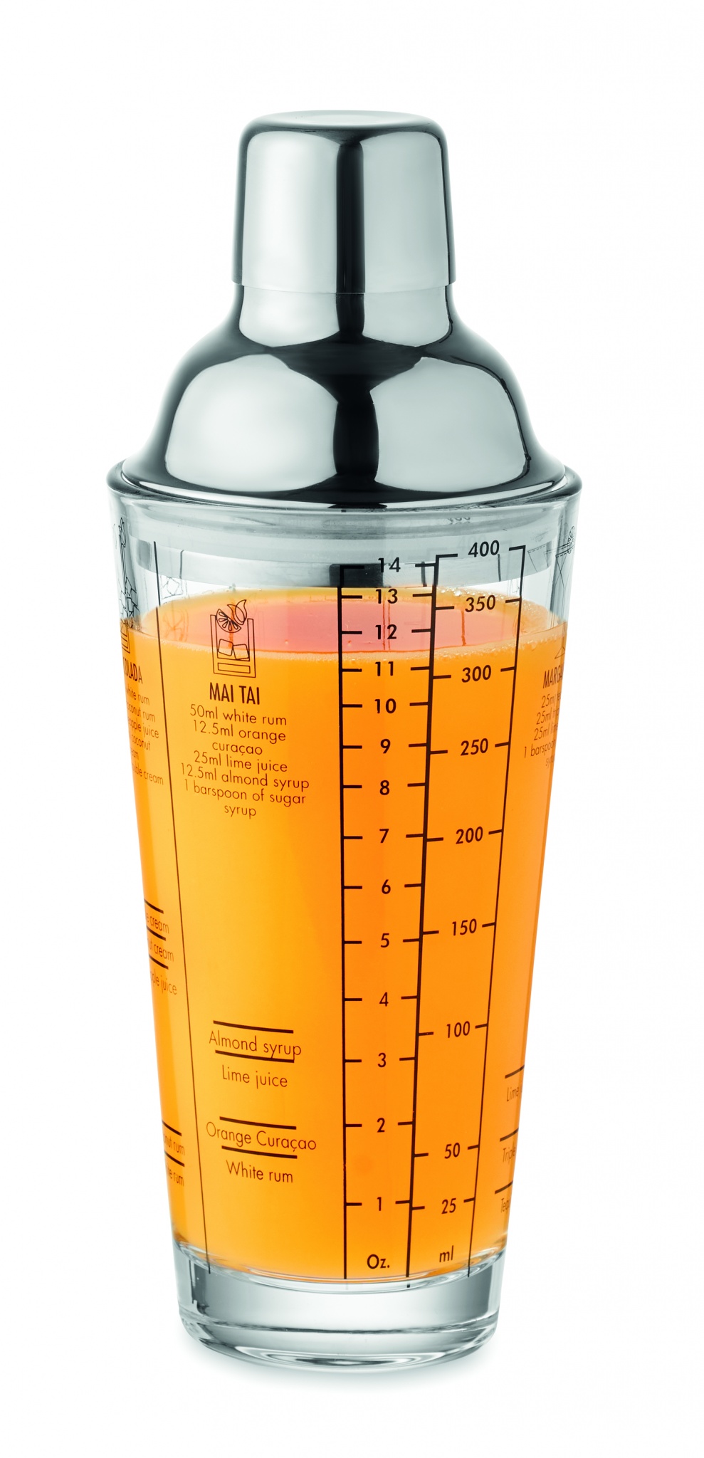 Roostevabast terasest kaanega klaasist kokteilišeiker koos kurnaga. Klaasile trükitud kokteiliretseptid ja mõõdud. Mahutavus: 400 ml.