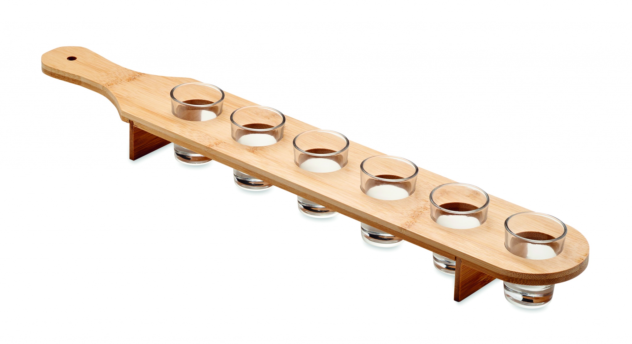 6 klaasist koosnev komplekt bambusest aerualusel. Mahutavus: 20 ml. Bambus on looduslik toode, ühe eseme värvis ja suuruses võib esineda väikesi erinevusi, mis võivad mõjutada lõppviimistlust.