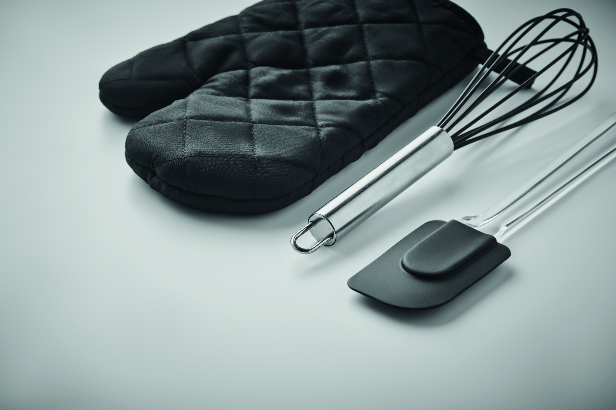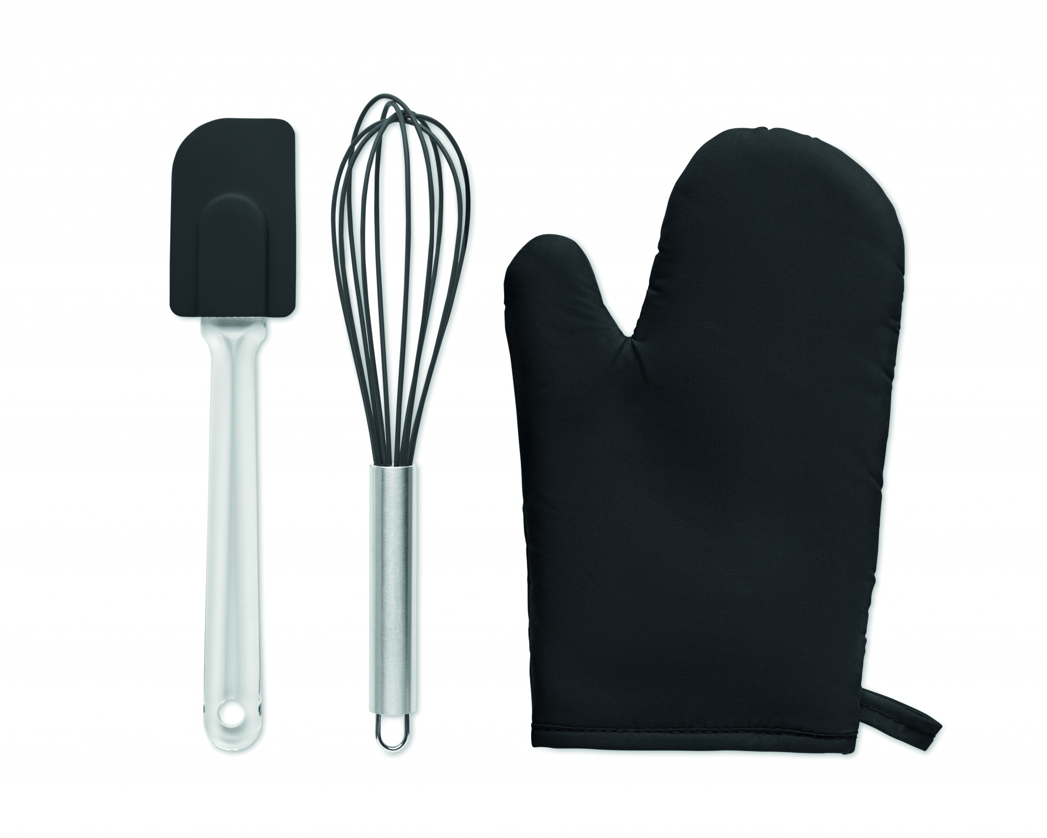 Küpsetusnõude komplekt. Kaasas polüpuuvillane (95% polüester ja 5% puuvill) ahjukinnas, vispel ja silikoonist spaatel.