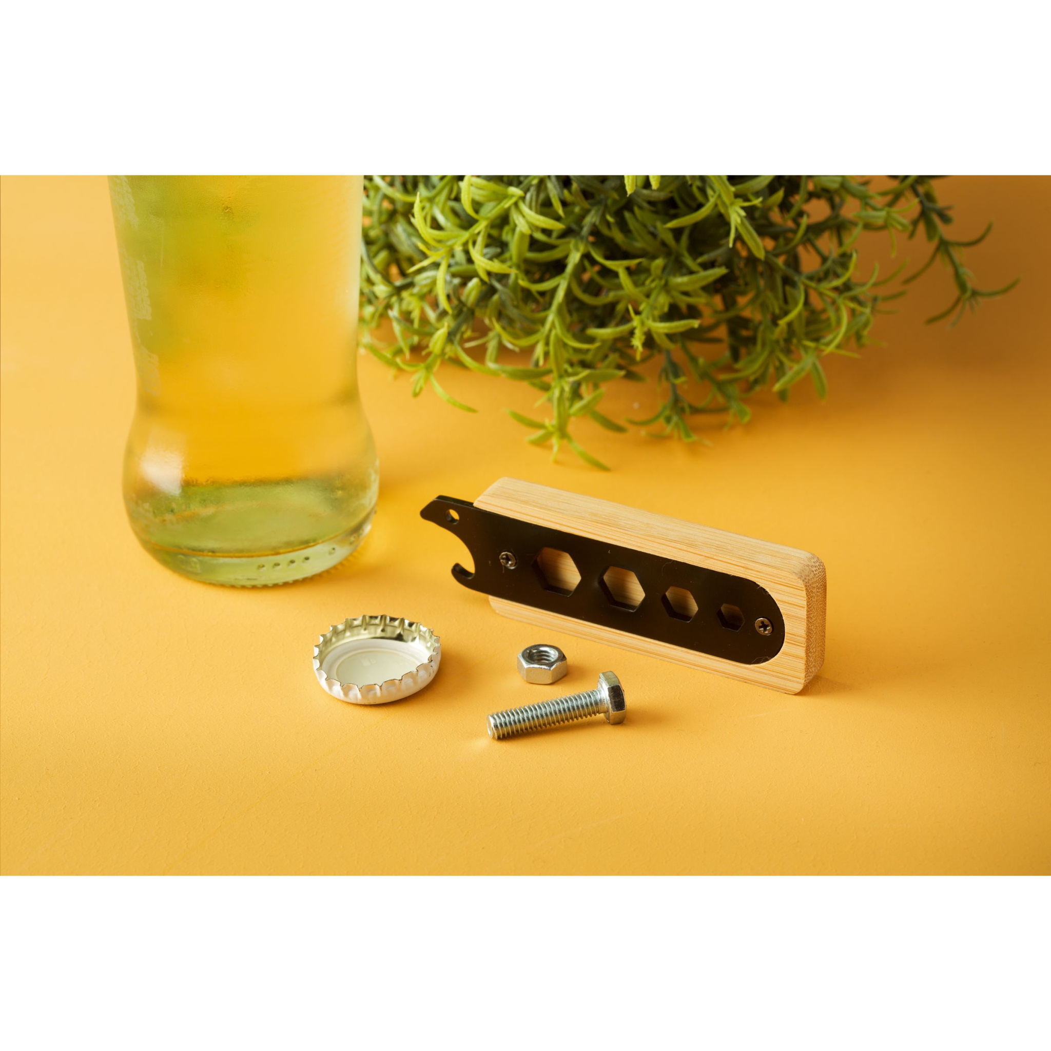 Käepärane multitööriist bambusest käepidemega roostevabast terasest pudeliavaja ja 4 erinevas suuruses lamevõtmega.