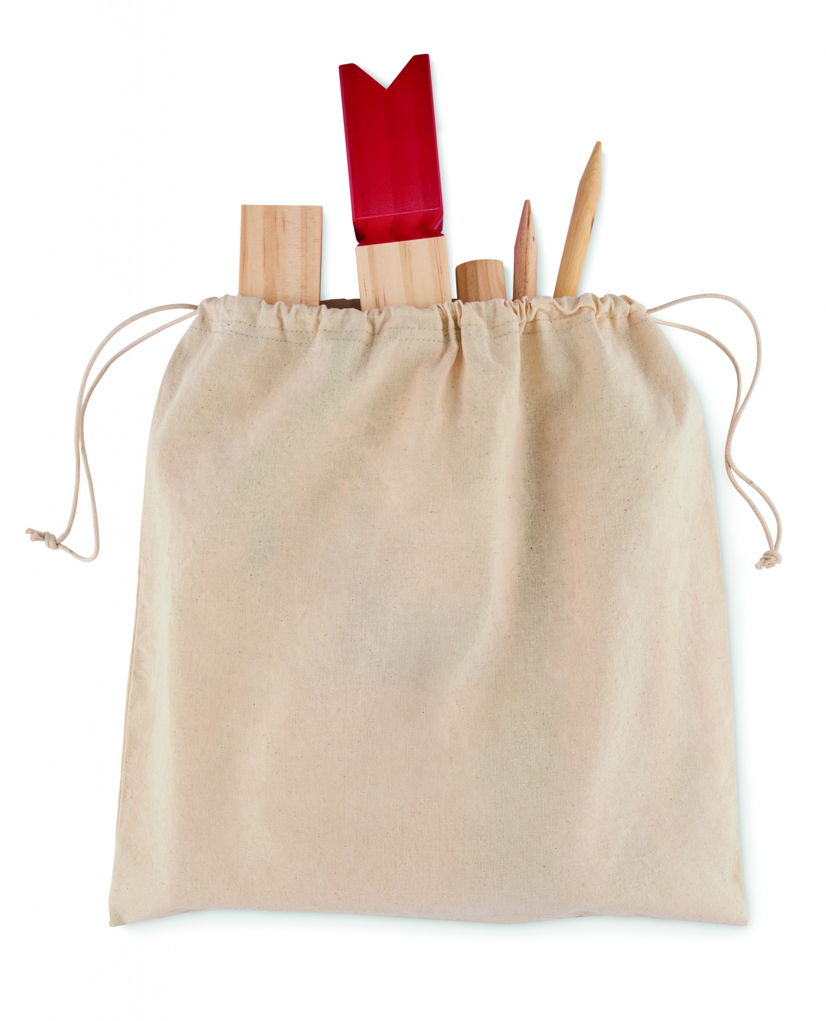 Männipuidust viskemäng puuvillases nöörikotis. Sisaldab 10 tk lühikest ruudukujulist pulka, 4 tk teravat pulka, 6 tk ümmargust pulka ja 1 tk King pulka.